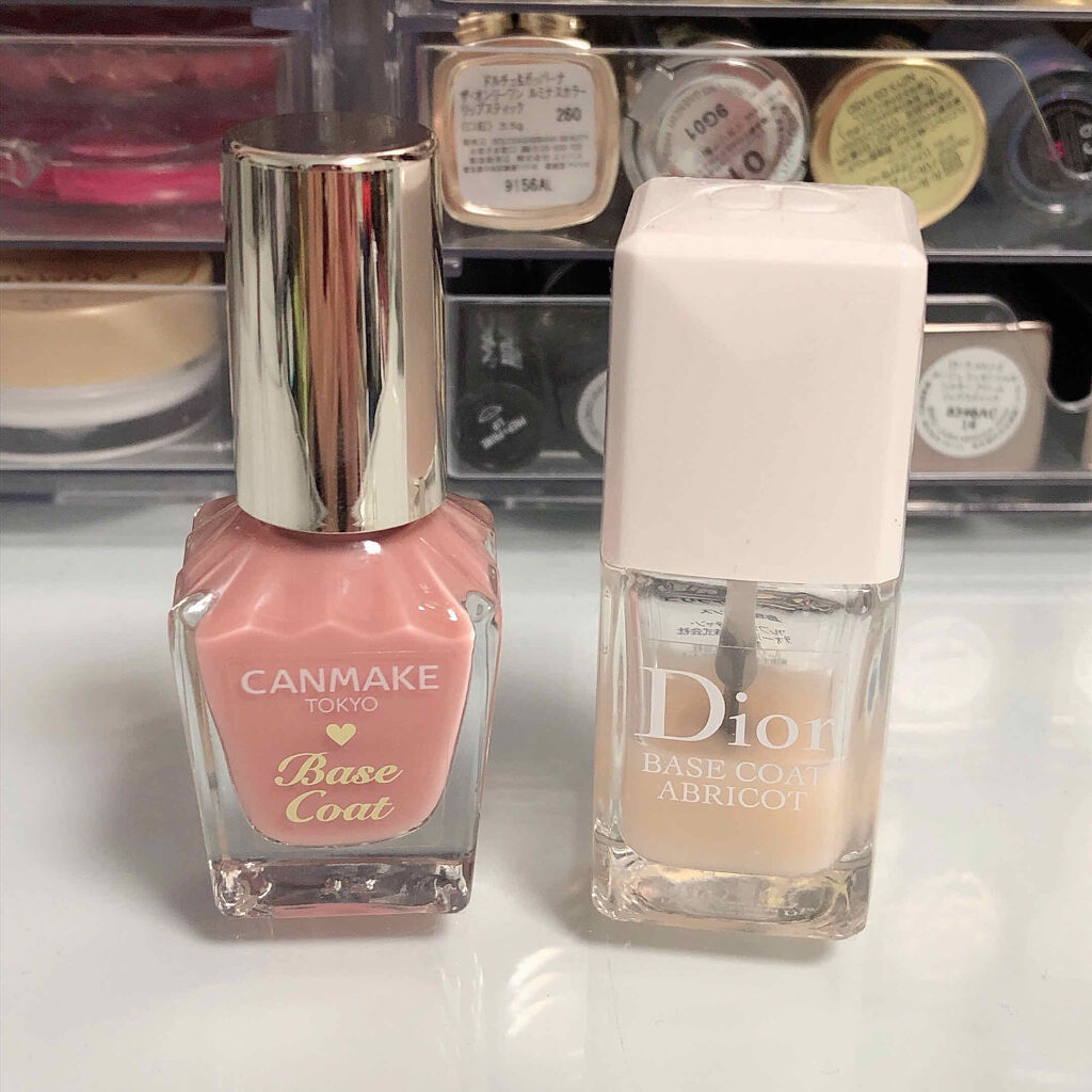 爪の凸凹や黄ばみ、色ムラがが気になる時はベースコートでカバー✨ Dior ベース コート アブリコは生産終了になり、現在はベース ヴェルニ として販売されています。 ほんのり乳白色ですが塗ると透明に近く、なのに色ムラをほんのり整えてくれます。 ACサロンネイルプライマーはほんのりピンクにブルーパールがさり気なく光るSeriaで買える110円ベース✨ この組み合わせでモチもよく表面も整って後のカラーが綺麗にできるのでお気に入りです✨