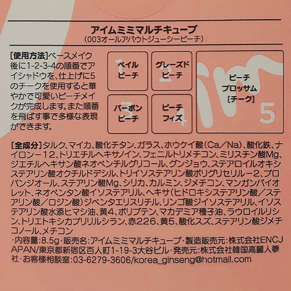 - <001 スウィートピンク> タルク、マイカ、グンジョウ、トリ(カプリル酸/カプリン酸)グリセリル、シリカ、窒化ホウ素、ステアロイルオキシステアリン酸オクチルドデシル、メチルプロパンジオール、ミリスチン酸Mg、マンガンバイオレット、ジメチコン、ミネラルオイル、プロパンジオール、赤酸化鉄、ヒドロキシプロピルビスパルミタミドMEA、ステアリン酸ジメチコノール、黄酸化鉄、ステアリン酸Mg、黒酸化鉄、トリエトキシカプリリルシラン、酸化チタン、メチコン、水 <002 ハローピーチ> マイカ、タルク、ホウケイ酸(Ca/Al)、酸化チタン、シリカ、ジエチルヘキサン酸ネオペンチルグリコール、フェニルトリメチコン、赤酸化鉄、グンジョウ、リンゴ酸ジイソステアリル、ヘキサ(ヒドロキシステアリン酸/ステアリン酸/ロジン酸)ジペンタエリスリチル、ネオペンタン酸イソステアリル、ステアロイルオキシステアリン酸オクチルドデシル、ミリスチン酸Mg、マンガンバイオレット、メチルプロパンジオール、ジメチコン、マカデミア種子油、ポリブテン、ステアリン酸Mg、プロパンジオール、トリエトキシカプリリルシラン、酸化スズ、メチコン、水 <003 ベイクド ジンジャー> タルク、マイカ、グンジョウ、シリカ、マンガンバイオレット、酸化チタン、トリ(カプリル酸/カプリン酸)グリセリル、赤酸化鉄、窒化ホウ素、黄酸化鉄、黒酸化鉄、ミリスチン酸Mg、ミネラルオイル、ステアロイルオキシステアリン酸オクチルドデシル、メチルプロパンジオール、ジメチコン、プロパンジオール、黄色4号、ヒドロキシプロピルビスパルミタミドMEA、ステアリン酸ジメチコノール、ステアリン酸Mg、トリエトキシカプリリルシラン、水 <004 グラムローズ> ホウケイ酸(Ca/Al)、タルク、ホウケイ酸(Ca/チタン)、マイカ、ジエチルヘキサン酸ネオペンチルグリコール、酸化チタン、フェニルトリメチコン、シリカ、ミリスチン酸Mg、リンゴ酸ジイソステアリル、ヘキサ(ヒドロキシステアリン酸/ステアリン酸/ロジン酸)ジペンタエリスリチル、ネオペンタン酸イソステアリル、ステアロイルオキシステアリン酸オクチルドデシル、グンジョウ、ステアリン酸Mg、メタクリル酸メチルクロスポリマー、メチルプロパンジオール、ポリブテン、プロパンジオール、酸化スズ、ジメチコン、ラウロイルリシン、マンガンバイオレット、赤酸化鉄、トリエトキシカプリリルシラン、黄酸化鉄、メチコン、水