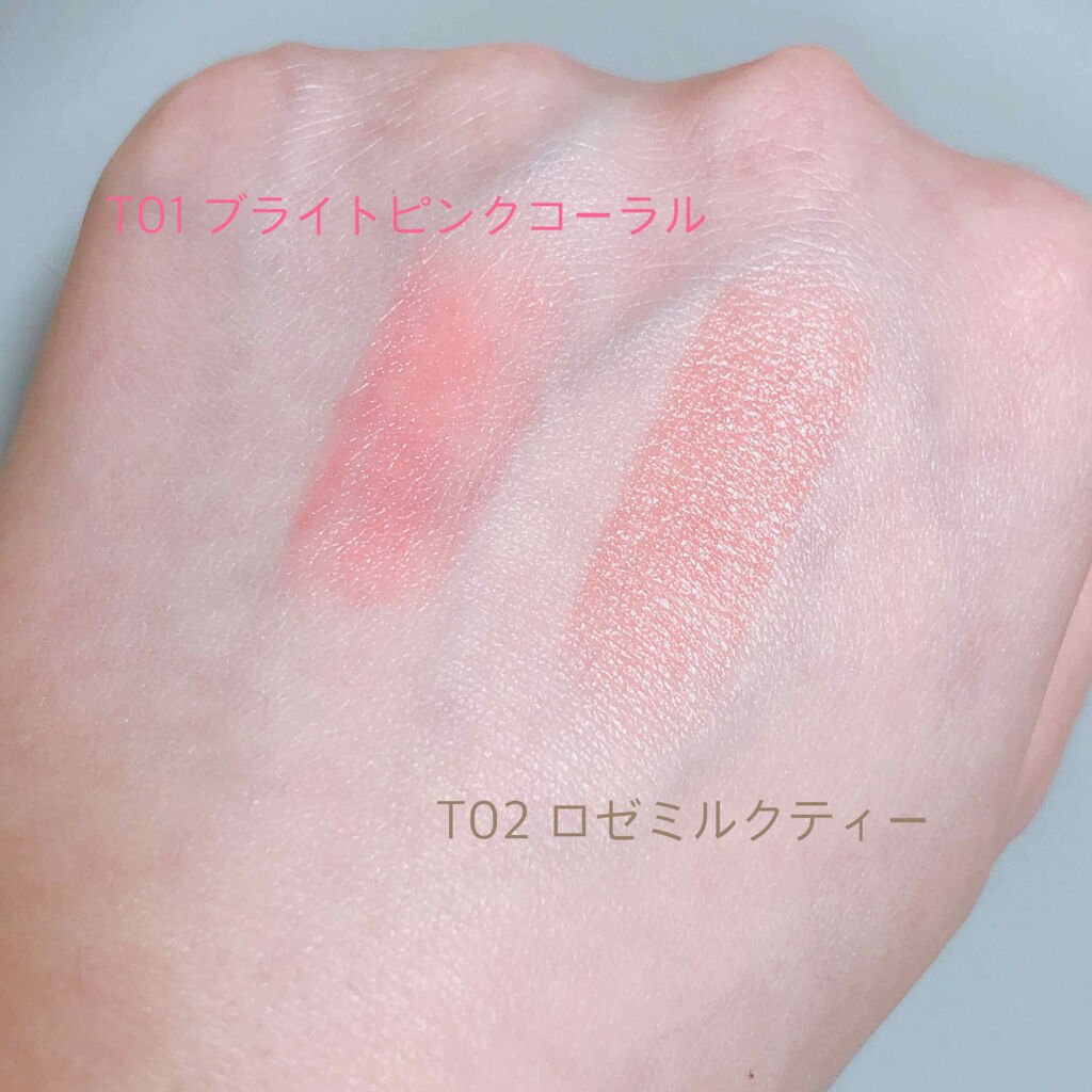 - <T02 ロゼミルクティー> トリエチルヘキサノイン、リンゴ酸ジイソステアリル、ワセリン、イソステアリン酸水添ヒマシ油、ダイマージリノール酸水添ヒマシ油、合成ワックス、ヘキサ(ヒドロキシステアリン酸/ステアリン酸/ロジン酸)ジペンタエリスリチル、ミツロウ、(HDI/トリメチロールヘキシルラクトン)クロスポリマー、メタクリル酸メチルクロスポリマー、(エチレン/プロピレン)コポリマー、ミネラルオイル、キャンデリラロウエステルズ、ヒマワリ種子ロウ、ペンタステアリン酸ポリグリセリル-10、トコフェロール、グリチルレチン酸ステアリル、スクワラン、セラミドNP、ナイアシンアミド、酸化チタン、黄4、酸化鉄、赤201、青1、赤202、水酸化Al、赤223 <T03 ディアレストレッド> トリエチルヘキサノイン、リンゴ酸ジイソステアリル、ワセリン、イソステアリン酸水添ヒマシ油、ダイマージリノール酸水添ヒマシ油、合成ワックス、ヘキサ(ヒドロキシステアリン酸/ステアリン酸/ロジン酸)ジペンタエリスリチル、ミツロウ、(HDI/トリメチロールヘキシルラクトン)クロスポリマー、メタクリル酸メチルクロスポリマー、(エチレン/プロピレン)コポリマー、ミネラルオイル、キャンデリラロウエステルズ、ヒマワリ種子ロウ、ペンタステアリン酸ポリグリセリル-10、トコフェロール、グリチルレチン酸ステアリル、スクワラン、セラミドNP、ナイアシンアミド、黄4、酸化チタン、赤201、赤202、酸化鉄、赤223、水酸化Al <T04 スウィートガナッシュ> トリエチルヘキサノイン、リンゴ酸ジイソステアリル、ワセリン、イソステアリン酸水添ヒマシ油、ダイマージリノール酸水添ヒマシ油、合成ワックス、ヘキサ(ヒドロキシステアリン酸/ステアリン酸/ロジン酸)ジペンタエリスリチル、ミツロウ、(HDI/トリメチロールヘキシルラクトン)クロスポリマー、メタクリル酸メチルクロスポリマー、(エチレン/プロピレン)コポリマー、ミネラルオイル、キャンデリラロウエステルズ、ヒマワリ種子ロウ、ペンタステアリン酸ポリグリセリル-10、トコフェロール、グリチルレチン酸ステアリル、スクワラン、セラミドNP、ナイアシンアミド、酸化鉄、酸化チタン、黄4、赤202、赤223、水酸化Al、赤201 <T06 サクラエンジェル> トリエチルヘキサノイン、リンゴ酸ジイソステアリル、ワセリン、イソステアリン酸水添ヒマシ油、ダイマージリノール酸水添ヒマシ油、合成ワックス、ヘキサ(ヒドロキシステアリン酸/ステアリン酸/ロジン酸)ジペンタエリスリチル、ミツロウ、(HDI/トリメチロールヘキシルラクトン)クロスポリマー、メタクリル酸メチルクロスポリマー、(エチレン/プロピレン)コポリマー、ミネラルオイル、キャンデリラロウエステルズ、ヒマワリ種子ロウ、ペンタステアリン酸ポリグリセリル-10、トコフェロール、グリチルレチン酸ステアリル、スクワラン、セラミドNP、ナイアシンアミド、酸化チタン、水酸化Al、赤223、赤104(1)、黄4、赤201