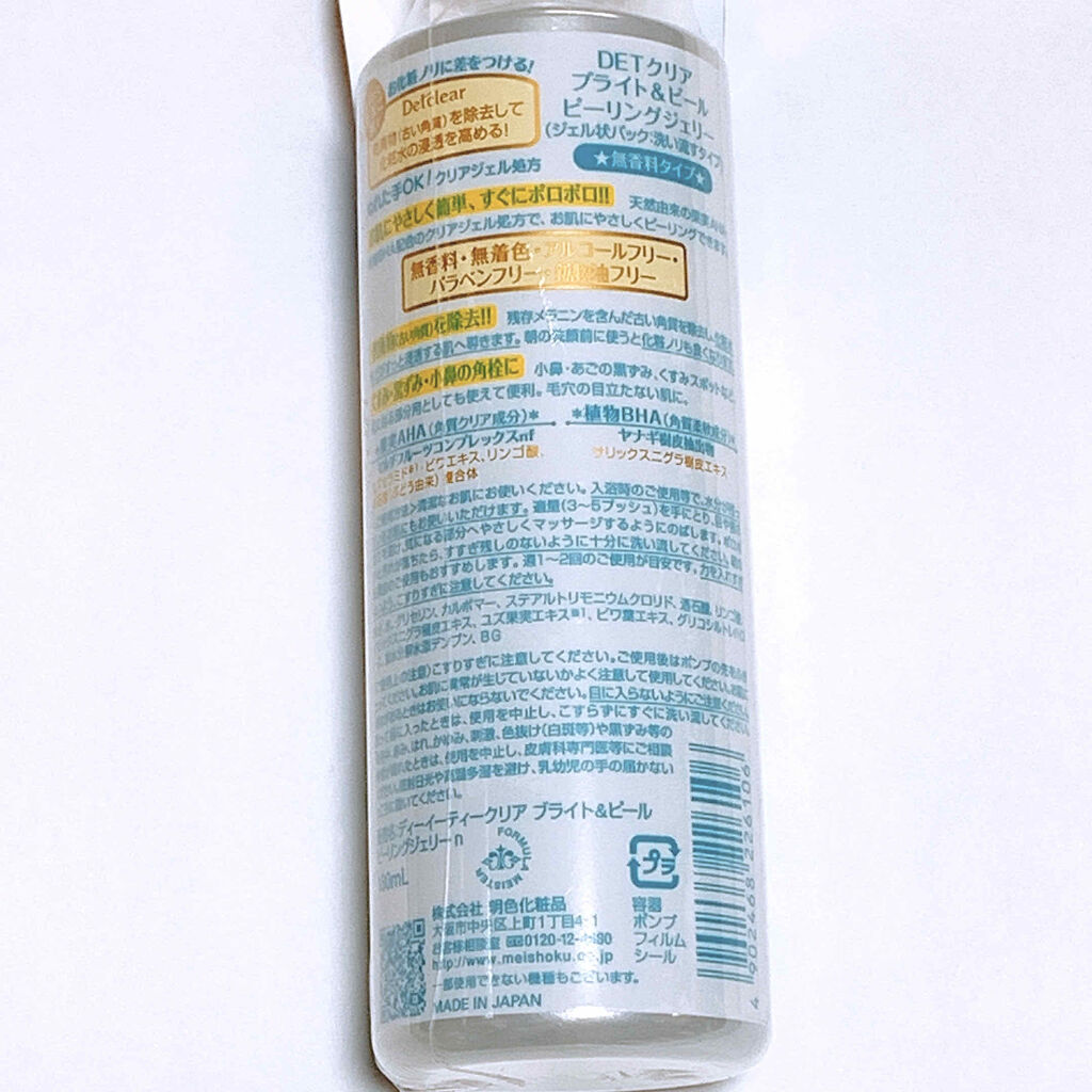 DETクリアブライト&ピールピーリングジェリー〈無香料タイプ〉を使用しました。やさしくクルクルするだけで不要な角質や汚れを絡め取るピーリングジェリーです。果実AHA&植物BHAで余分な角質を浮き上がらせ角質をやわらかくするそうです。無香料・無...