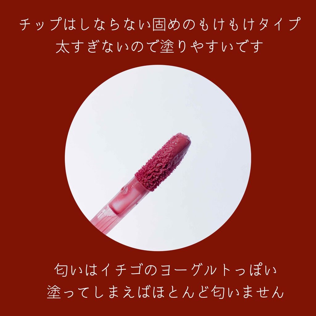 - みずみずしいフルーツがきらめくようなシロップティント ①なめらかで潤いのあるリップを実現 ②果汁のシロップのようなカラー感 ③時間が経つにつれ凸凹を滑らかに密着しボリューム感を演出