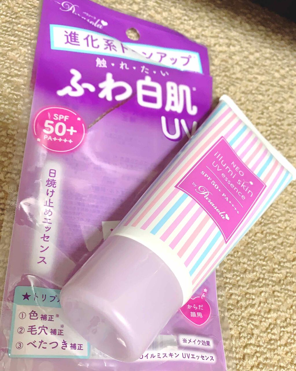 - トーンアップするだけの日焼け止めに満足できない人に。 トリプル補正効果搭載! 進化系トーンアップUV(*1) 【パラソーラ ネオイルミスキン UVエッセンス PK】誕生! ▽基本情報▽ SPF50+/PA++++。 トリプル補正効果搭載で理想の白肌へ。 ①色補正(*1):ラベンダーカラーで透明感&トーンアップ。黄ぐすみを抑えながらトーンアップし、透明感を底上げすることで儚げな白肌へ。 ②毛穴補正(*1):ソフトフォーカス効果パウダー((ビニルジメチコンメチコンシルセスキオキサン)クロスポリマー)配合で肌キレイ魅せ。気になる毛穴・凹凸をカバーし、均一美肌へ。 ③べたつき補正:汗吸着パウダー(シリカ)・べたつき抑制成分(ラフィノース)配合で、さらさら、すべすべ。触れたくなるふんわりやわらかな肌へ。 ●深紫外線対応成分、10種の美容成分(*2)(保湿成分)配合。 ●汗、水に強いウォータープルーフタイプ。ボディソープで落とせます。 ●化粧下地としても。 ●無香料・無鉱物オイル・弱酸性。 *1 メイク効果 *2 保湿型ビタミンC誘導体(リン酸アスコルビルMg)、浸透型ビタミンC誘導体(テトラヘキシルデカン酸アスコルビル)、高浸透型ビタミンC誘導体(パルミチン酸アスコルビルリン酸3Na)、アルブチン、プラセンタエキス、ハトムギエキス(ハトムギ種子エキス)、セラミド(セラミド3)、ヒアルロン酸(ヒアルロン酸Na)、コラーゲン(水溶性コラーゲン)、リピジュア○R(ポリクオタニウム-51)