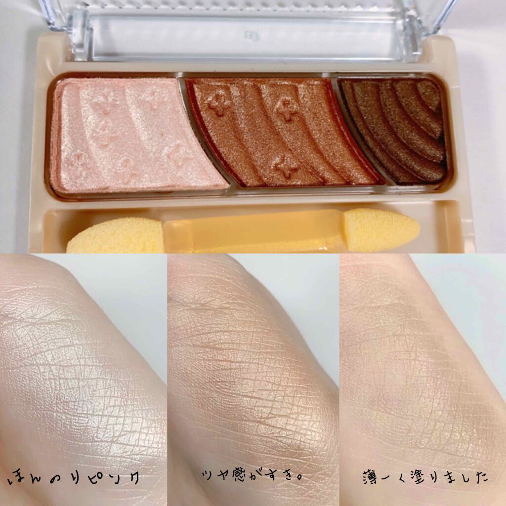 - 3色で簡単に明るく大きな目元に。 しっとり感触のアイシャドウ。 くすみを飛ばす明るさベース、ひとえ・奥二重の方でも幅広く塗れる肌なじみの良い中間色、 濃密高発色の締め色が目の輪郭を強調し大きな目元に。 微細パール配合でくすみを飛ばし、明るい目元へ。