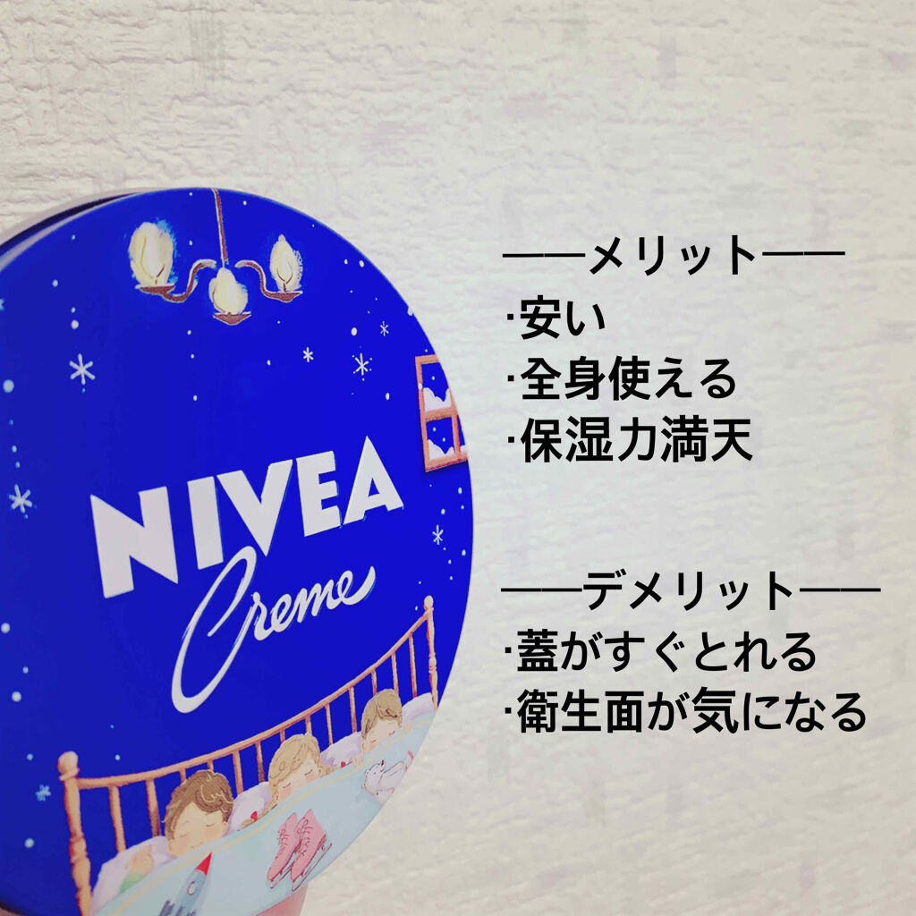 - 健康でしっとりした素肌を保つスキンケアクリーム。 乾いた空気・冷たい外気から肌を保護し、肌荒れ・カサつきを防ぎます。 人の肌本来の、天然の皮脂膜を補う成分が、素肌になじみ、やさしく守ります。 ※「ニベア」とはラテン語で「雪のように白い」という意味です。 ・顔にも身体にも、全身のスキンケアに家族みんなで使えます。 ・スクワラン・ホホバオイル配合。肌にうるおいを与えます。 ・お出かけ前や洗顔・入浴後のご使用が効果的です。 ・容量:169g、56g、50g