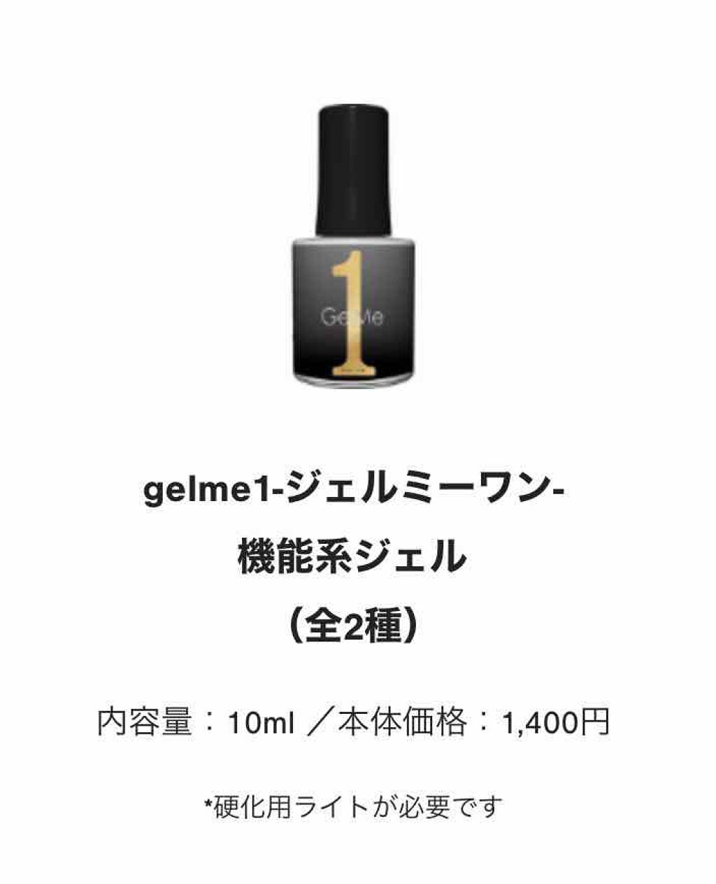 GelMe1ジェルミーワン¥1400(税抜き)簡単セルフジェルネイル!塗って硬化させるだけで、ぷっくりつやつやな出来上がり!ジェルで硬化するので、爪の補強にもなって嬉しい!*以下、ジェルミーワンの使い方です!<用意するもの>・ジェルミーワン・...