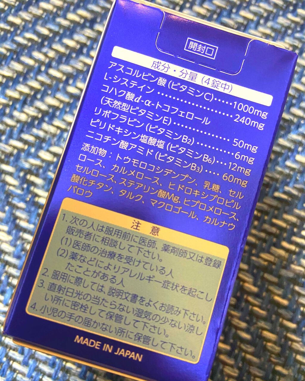 - <60錠> アスコルビン酸(ビタミンC)1000mg、L-システイン240mg、コハク酸d-α-トコフェロール(天然型ビタミンE)50mg、リボフラビン(ビタミンB2)6mg、ピリドキシン塩酸塩(ビタミンB6)12mg、ニコチン酸アミド(ビタミンB3)60mg、トウモロコシデンプン、乳糖、セルロース、カルメロース、ヒドロキシプロピルセルロース、ステアリン酸Mg、ヒプロメロース、酸化チタン、タルク、マクロゴール、カルナウバロウ <120錠> アスコルビン酸(ビタミンC)1000mg、L-システイン240mg、コハク酸d-α-トコフェロール(天然型ビタミンE)50mg、リボフラビン(ビタミンB2)6mg、ピリドキシン塩酸塩(ビタミンB6)12mg、ニコチン酸アミド(ビタミンB3)60mg、トウモロコシデンプン、乳糖、セルロース、カルメロース、ヒドロキシプロピルセルロース、ステアリン酸Mg、ヒプロメロース、酸化チタン、タルク、マクロゴール、カルナウバロウ <240錠> アスコルビン酸(ビタミンC)1000mg、L-システイン240mg、コハク酸d-α-トコフェロール(天然型ビタミンE)50mg、リボフラビン(ビタミンB2)6mg、ピリドキシン塩酸塩(ビタミンB6)12mg、ニコチン酸アミド(ビタミンB3)60mg、トウモロコシデンプン、乳糖、セルロース、カルメロース、ヒドロキシプロピルセルロース、ステアリン酸Mg、ヒプロメロース、酸化チタン、タルク、マクロゴール、カルナウバロウ
