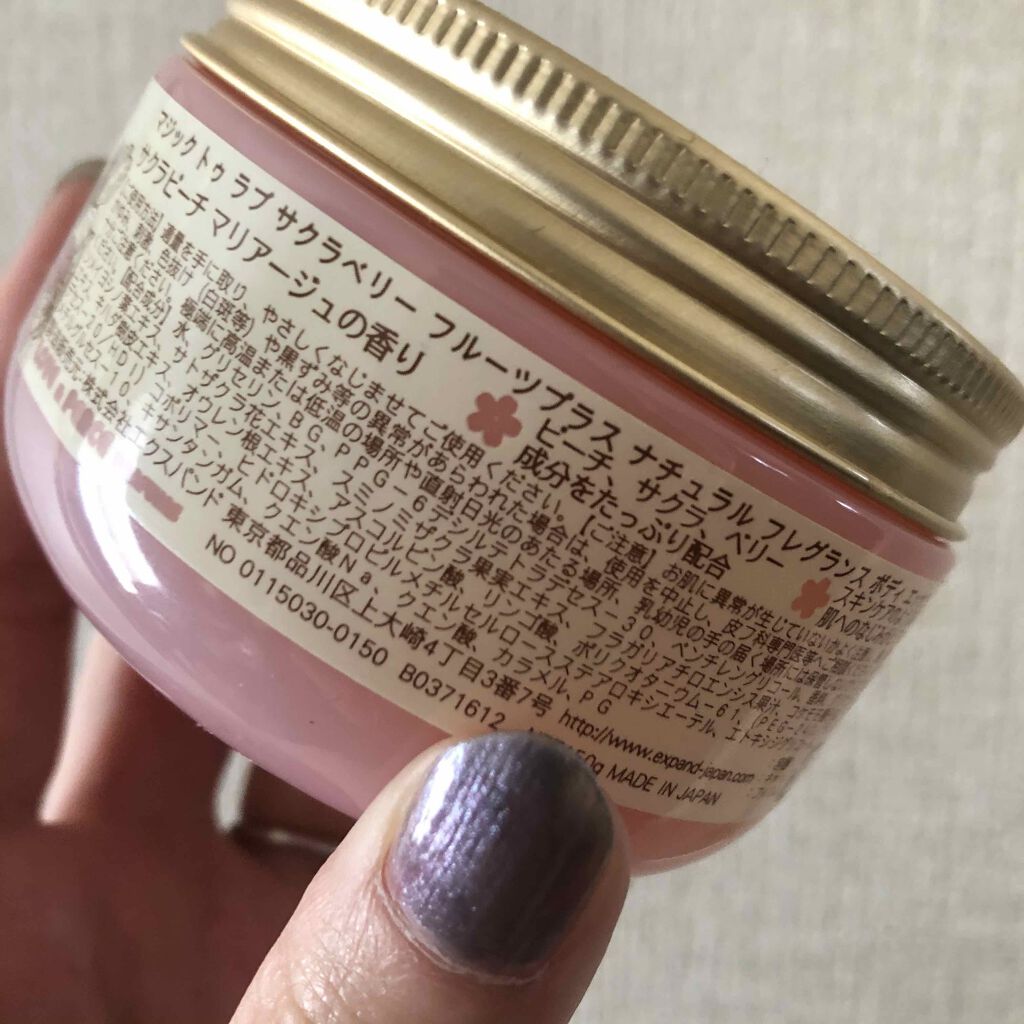 ご紹介する商品はこちらです。『マジックトゥラブサクラベリーフルーツプラスナチュラルフレグランスボディミルクライト』サクラピーチマリアージュの香りパケと香りに惹かれて購入しました☺️ボディクリームあまり使わないのにこういうの大好き(笑)テクスチ...