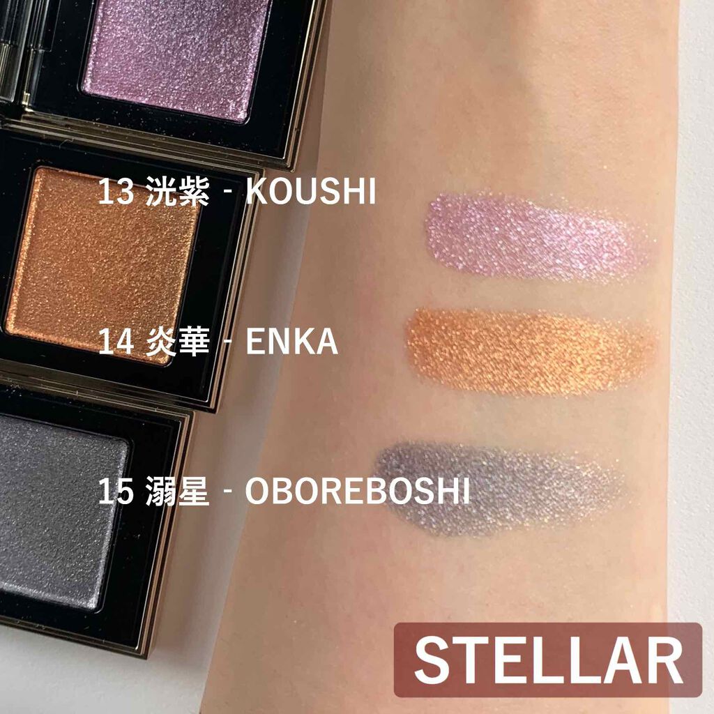 - 単色でも、重ねても絵になる。 まぶたをキャンバスに、新しい個性を描きたくなる、待望のモノカラーアイシャドウが登場です。 フロスト、シルク、ステラ―。 異なる艶感を生み出す3タイプのなめらかなテクスチャーと高純度発色で、重ねてもにごらず、艶やかな目元へ。 3タイプの仕上がり艶感 ノンパール処方でピュアな色の濃淡を自在に楽しめる”フロスト”、絹のようななめらかな光を放つ”シルク”、星空のようにまばゆく輝き、光を反射する大粒パールを配合した”ステラ―”の3タイプの仕上がり艶感。 パッケージデザイン 持ち運びにも便利なスリムサイズのスクエアケース。開閉にマグネットを採用し、スタイリッシュかつ、大人の遊び心を刺激するパッケージです。