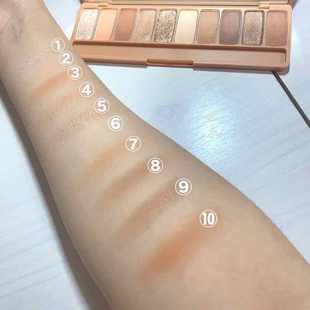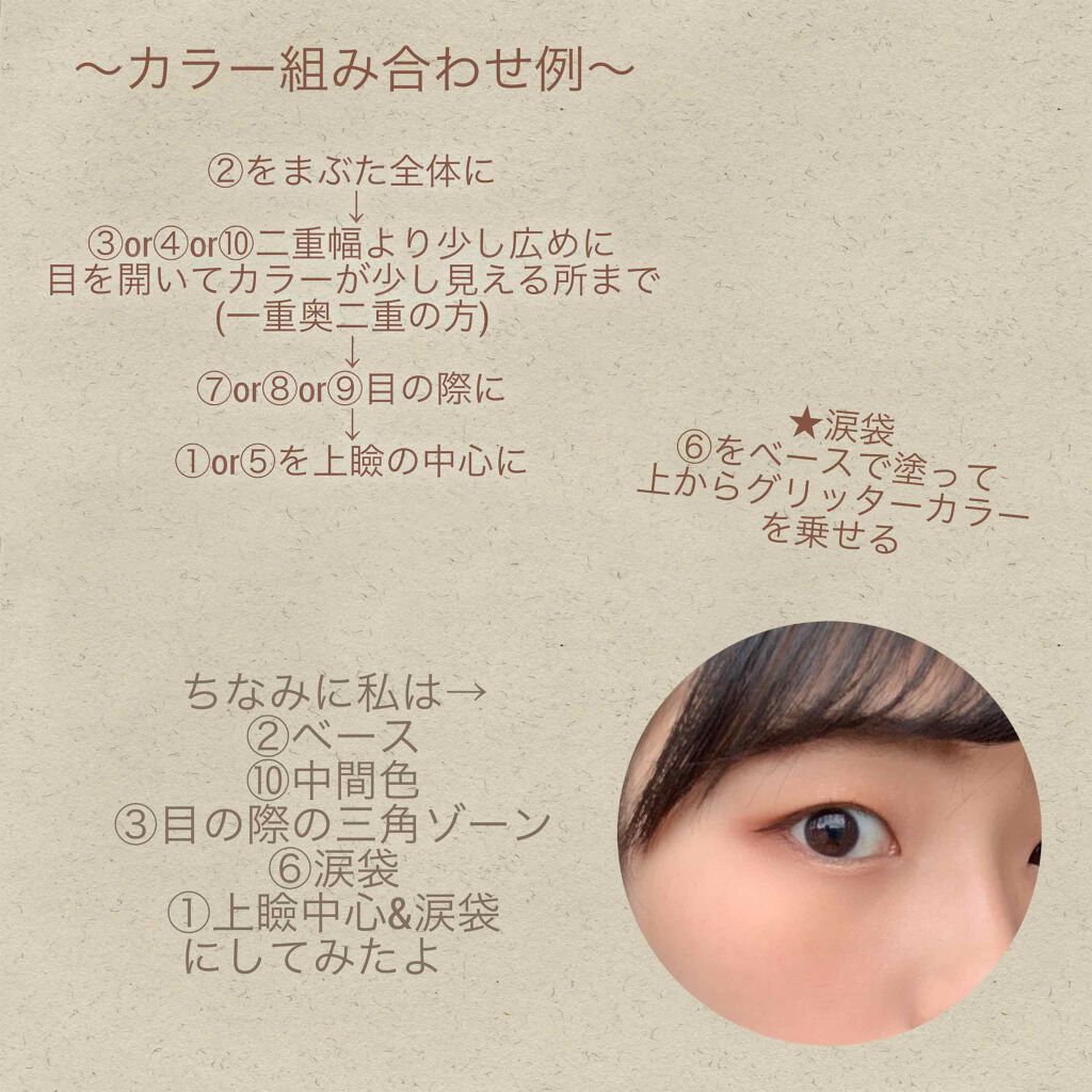 - 肌なじみの良い、鮮やかな発色で目元を華やかに彩る捨て色なしの10色アイシャドウパレット 異なる3種のテクスチャーを自由に組み合わせて、グラデーションも思いのままに。 NEW 2023.4 ・肌トーンにあう配色を詰め込んだトレンドカラー 肌トーンに合わせて、自分に似合うトレンドカラーが楽しめる♡ パーソナルカラー×トレンドカラーの掛け合わせパレットで、デイリーメイクもスペシャルメイクも気分にあわせてなりたい自分に! ・むにゅっとジェル質感ラメで高密着、煌めく目元 パレットの中でもポイントとなる大きめ粒子のラメは、ジェルのような新質感で落ちにくく肌にぴったりと密着します。キラキラとした目元をキープします。 ・使うカラーは大きめに!リアル捨て色なしパレット ベースやラメのよく使うカラーと締め色や濃い色等の減りが少ないカラーを異なるサイズで詰め込んだ、リアル捨て色なしパレット! <使用方法> 付属のデュアルシャドウブラシでベースカラーをまぶた全体に塗り広げます。細いブラシでグラデーションや目尻、アイライン、涙袋などのポイントカラーをのせて仕上げます。