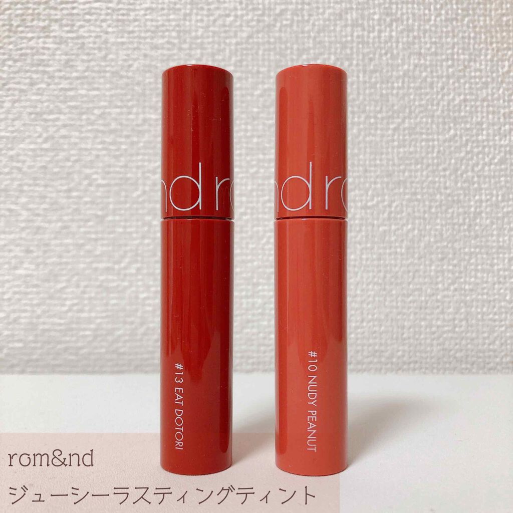 rom&ndジューシーラスティングティント⚪︎#13EATDOTORI⚪︎#10NUDYPEANUT⚪︎Qoo10で1本1000円で買えました🪐#13EATDOTORI深い赤で塗りかた次第で雰囲気を変えられます。#10NUDYPEANUT手に...