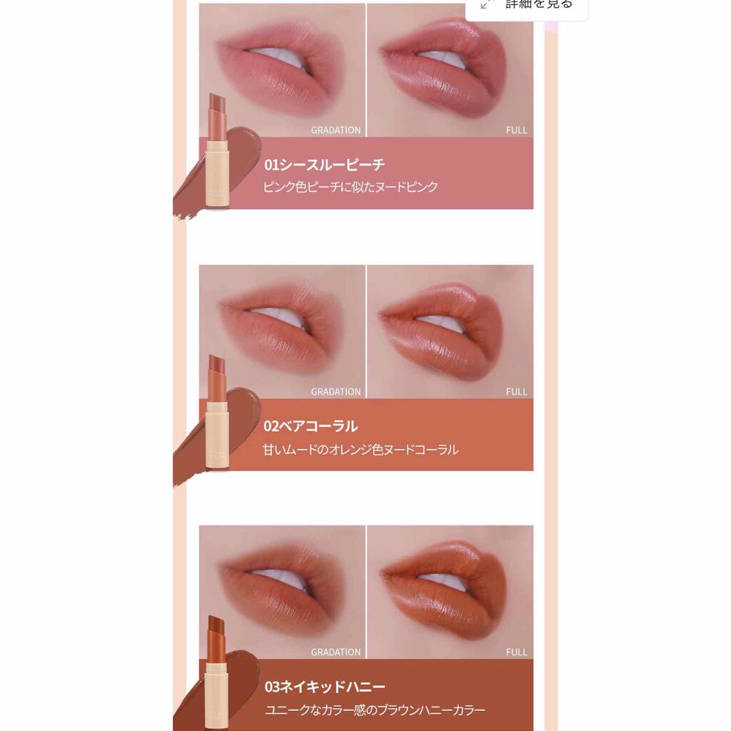 | 口紅・グロス・リップライナーランキング第9位 | 全色どこかまろやかさを感じる発色で デイリー使いしやすい粘膜の延長のようなカラー | 詳細を見る | |
