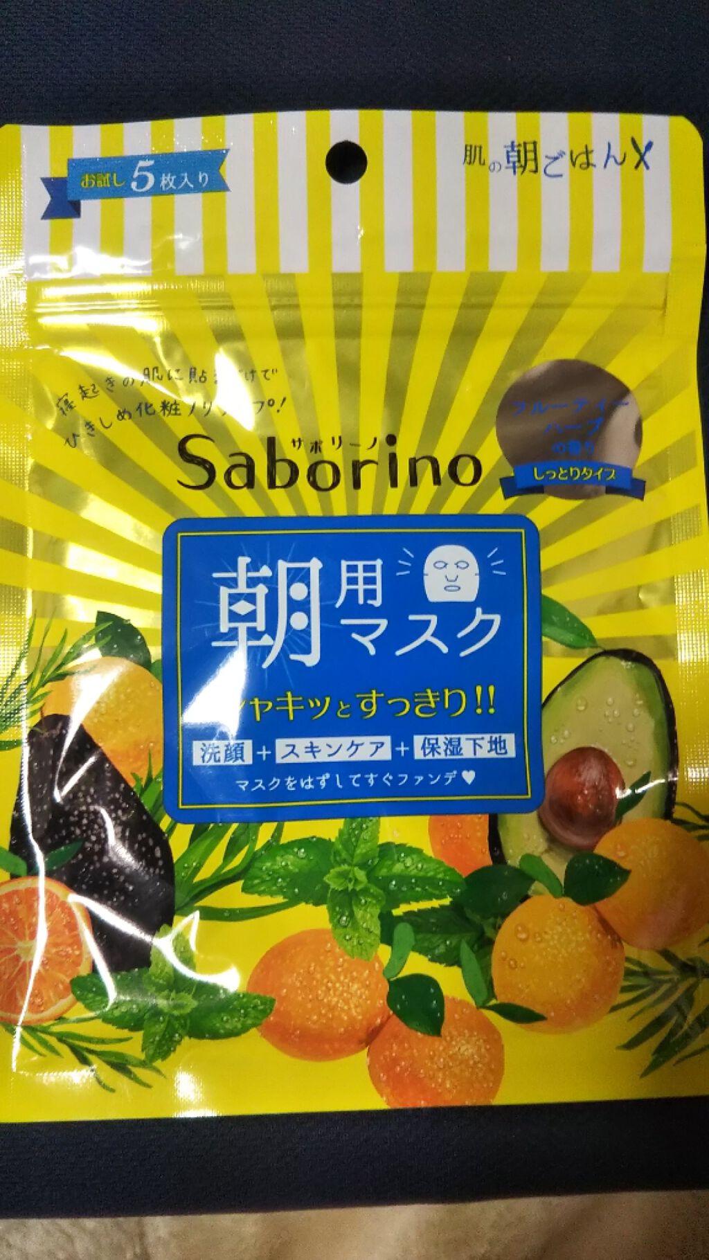 - シートマスク1枚で洗顔+スキンケア+保湿下地が完了! 寝起きの肌にそのまま貼るだけで、洗顔、スキンケア、保湿下地までできる朝用のオールインワンマスクです。 保湿成分をしっかり配合しながら、程よいメントール感で、寝起きの肌をすっきり引き締めます。 グレープフルーツ果皮エキス、オレンジ油 &アボカドエキスinのしっとりタイプ フルーティハーブの香り