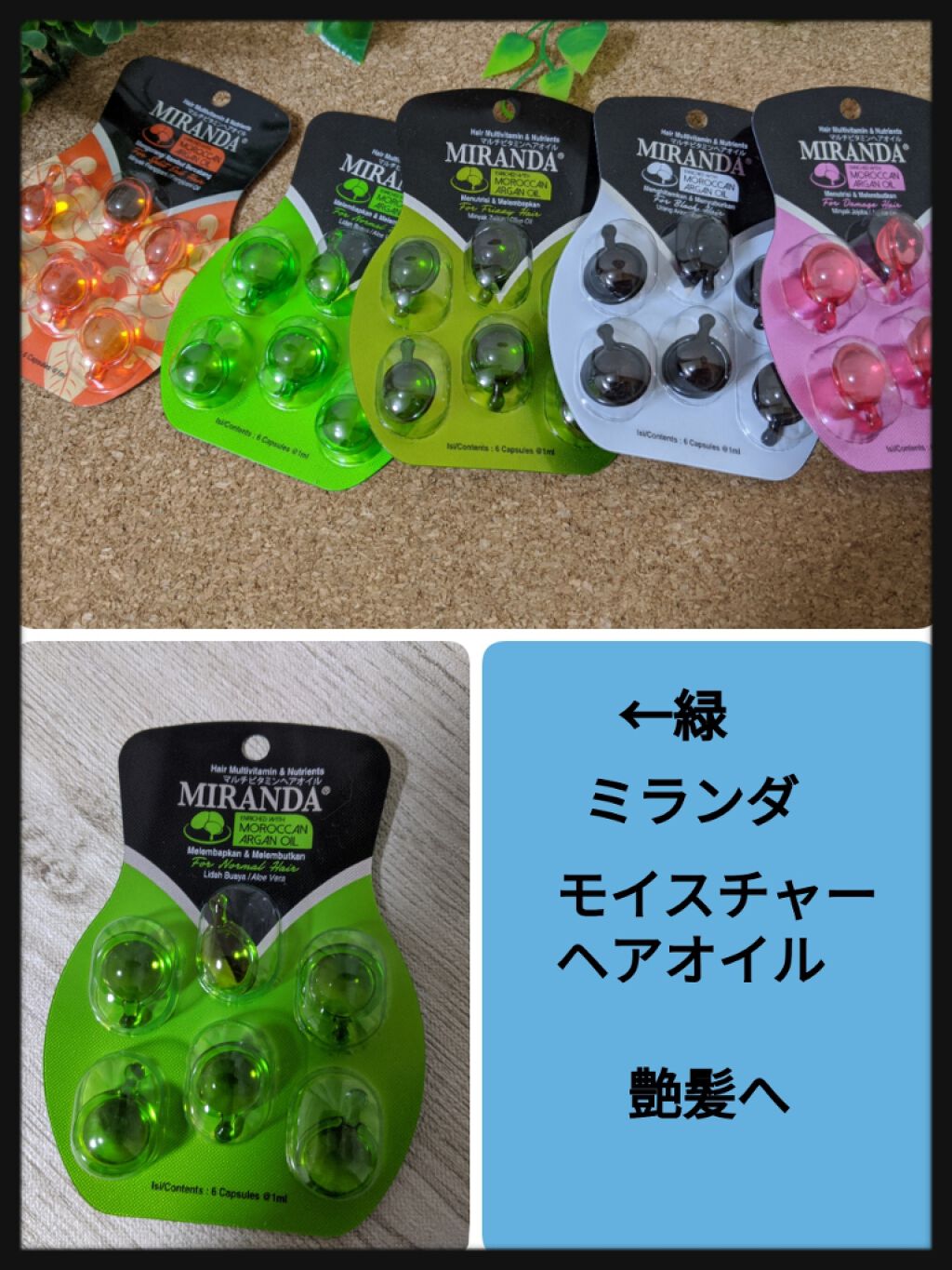 キャンドゥーで売ってた、ヘアオイル。MIRANDAヘアビタミンモイスチャーヘアオイルオリーブオイル、アロエベラモロッコ アルガンオイルが入っているみたい。バリ島のヘアオイルみたいです。使い心地は良かったです。べたつきすぎず髪洗った後乾かす前に...