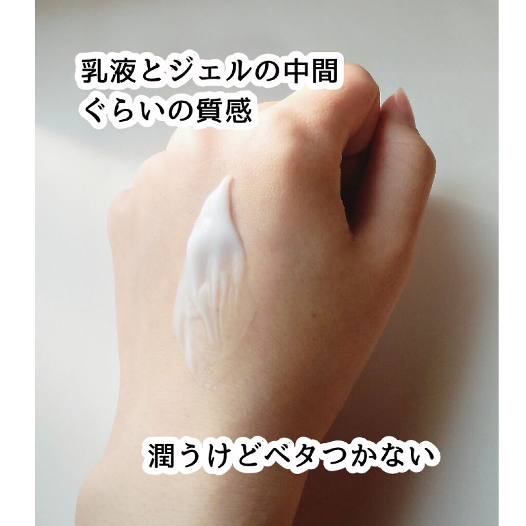 - 保湿成分 グリセリン 11.12%、BG 6.25%、トレハロース 0.23%、ヒアルロン酸Na 0.05%、加水分解ヒアルロン酸 0.01%、オウゴン根エキス 適量 油性エモリエント成分 トリエチルヘキサノイン 1.40%、ジフェニルジメチコン 1.00% 中和剤 アルギニン 0.70% 可溶化剤 PEG-60水添ヒマシ油 0.60% 増粘剤 カルボマー 0.50% 乳化剤 ミリスチン酸ポリグリセリル-10 0.32% 防腐剤 メチルパラベン 適量、フェノキシエタノール 適量 キレート剤 EDTA-2Na 0.01% 基剤 水 全量を100%とする