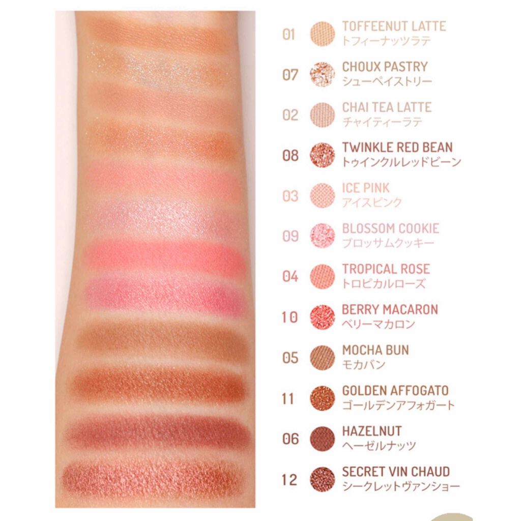- ピンクからブラウンまで捨て色ナシの12色をラインナップ。甘いデザートカラーでロマンティックなローズメイクに挑戦できます。保湿成分ダマスクローズオイル配合により、優しい使用感。従来のバレンタインボックスシリーズよりもさらにグレードアップしたグリッターテクスチャーで、美しい艶感と輝きのある目元を演出します。 アイスピンク ゴールデンアフォガート シューペイストリー シークレットヴァンショー チャイティーラテ トゥインクルレッドビーン トフィーナッツラテ トロピカルローズ ブロッサムクッキー ヘーゼルナッツ ベリーマカロン モカバン