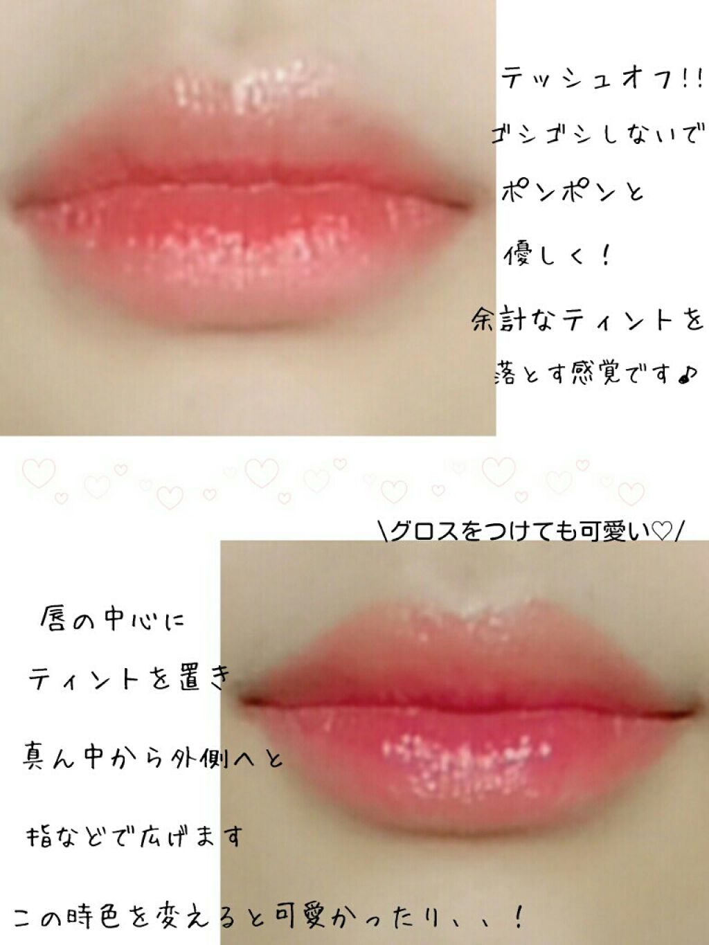 ✨色ムラにならない!ティントの使い方✨ウォーターティントってすごくムラが出来ません??今まで上手く使いこなせなかったのは私だけですかね、、コロナ休みで時間が沢山あったので研究してました𡔉結果が画像3、4枚目のやり方です♪グロスを重ねればある程...