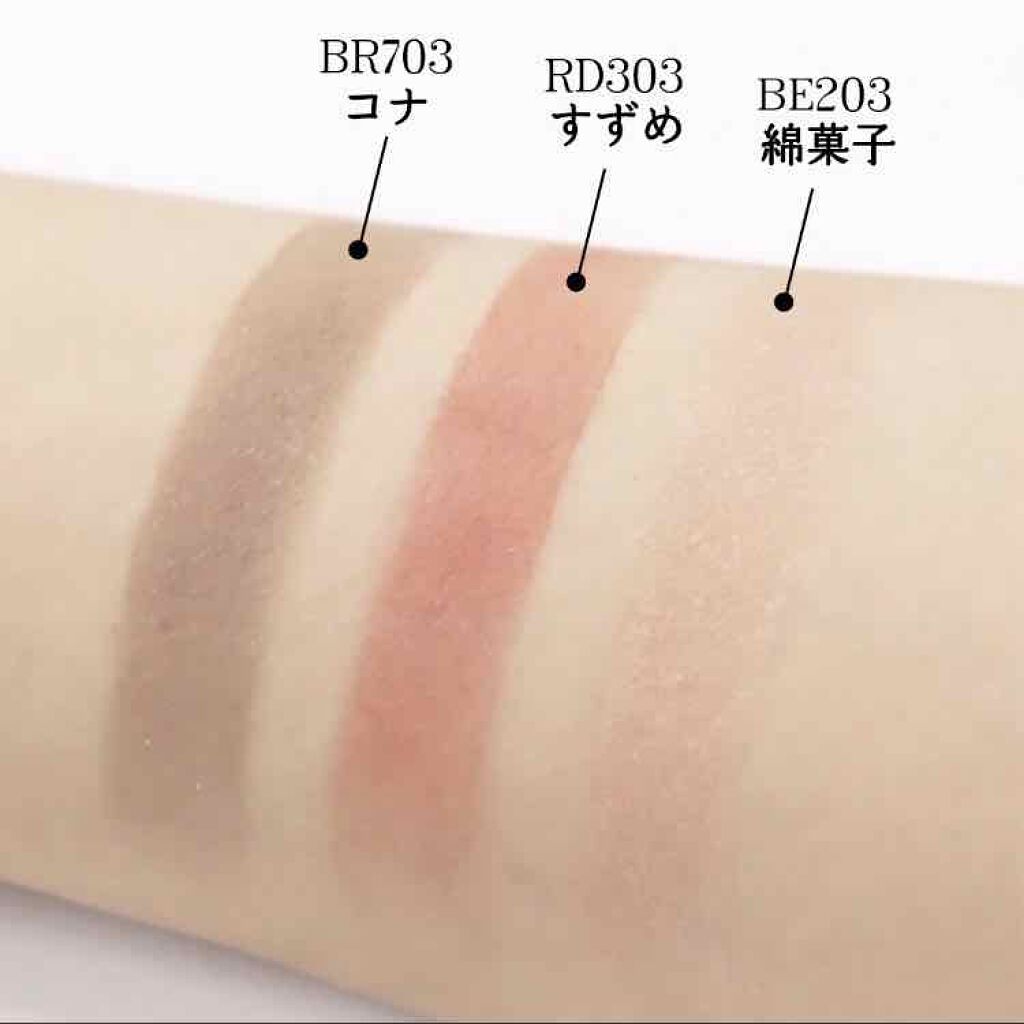 - <BE121 恋の達人> タルク、ワセリン、ジメチコン、セスキイソステアリン酸ソルビタン、ポリメタクリル酸メチル、ミネラルオイル、テトラヒドロテトラメチルシクロテトラシロキサン、テトラデセン、トコフェロール、エチルパラベン、(+/-)マイカ、酸化チタン、酸化鉄、合成金雲母、赤226、黄401、青404 <BE203 綿菓子> タルク、リンゴ酸ジイソステアリル、焼成セリサイト、トリエチルヘキサノイン、ワセリン、セスキイソステアリン酸ソルビタン、酸化亜鉛、ミリスチン酸亜鉛、エチルヘキシルグリセリン、ハイドロゲンジメチコン、酸化スズ、トリエトキシカプリリルシラン、トコフェロール、水酸化Al、テトラヒドロテトラメチルシクロテトラシロキサン、テトラデセン、クロルフェネシン、マイカ、合成金雲母、酸化チタン、酸化鉄 <BE286 ゴージャス姉妹> タルク、リンゴ酸ジイソステアリル、トリオクタノイン、セスキイソステアリン酸ソルビタン、ミリスチン酸亜鉛、シリカ、トコフェロール、テトラヒドロテトラメチルシクロテトラシロキサン、テトラデセン、エチルパラベン、マイカ、酸化チタン、酸化鉄、グンジョウ、酸化亜鉛、赤226 <BE330 マサラチャイ> タルク、リンゴ酸ジイソステアリル、メタクリル酸メチルクロスポリマー、トリエチルヘキサノイン、ワセリン、ミリスチン酸亜鉛、酸化亜鉛、セスキイソステアリン酸ソルビタン、エチルヘキシルグリセリン、アルミナ、酸化スズ、トコフェロール、テトラヒドロテトラメチルシクロテトラシロキサン、テトラデセン、クロルフェネシン、マイカ、酸化チタン、酸化鉄、合成金雲母、グンジョウ、赤226 <BE384 コルク> タルク、ワセリン、トリエチルヘキサノイン、ジメチコン、酸化亜鉛、セスキイソステアリン酸ソルビタン、メタクリル酸メチルクロスポリマー、ミリスチン酸亜鉛、エチルヘキシルグリセリン、酸化スズ、トリエトキシカプリリルシラン、トコフェロール、クロルフェネシン、マイカ、酸化鉄、酸化チタン、合成金雲母、グンジョウ <BK922 黒蜥蜴> タルク、リンゴ酸ジイソステアリル、トリエチルヘキサノイン、ワセリン、酸化亜鉛、セスキイソステアリン酸ソルビタン、ミリスチン酸亜鉛、エチルヘキシルグリセリン、テトラヒドロテトラメチルシクロテトラシロキサン、テトラデセン、トコフェロール、クロルフェネシン、マイカ、酸化鉄、合成金雲母、酸化チタン、コンジョウ、グンジョウ <BR331 シナモン> タルク、リンゴ酸ジイソステアリル、メタクリル酸メチルクロスポリマー、トリエチルヘキサノイン、ワセリン、セスキイソステアリン酸ソルビタン、酸化亜鉛、ミリスチン酸亜鉛、エチルヘキシルグリセリン、酸化スズ、テトラヒドロテトラメチルシクロテトラシロキサン、トコフェロール、テトラデセン、クロルフェネシン、マイカ、酸化鉄、合成金雲母、酸化チタン <BR332 胡桃> タルク、リンゴ酸ジイソステアリル、メタクリル酸メチルクロスポリマー、トリエチルヘキサノイン、ワセリン、酸化亜鉛、ミリスチン酸亜鉛、セスキイソステアリン酸ソルビタン、エチルヘキシルグリセリン、酸化スズ、トコフェロール、テトラヒドロテトラメチルシクロテトラシロキサン、テトラデセン、ヒドロキシプロピルセルロース、クロルフェネシン、マイカ、酸化チタン、酸化鉄、合成金雲母、コンジョウ <BR583 テディ> タルク、ワセリン、トリエチルヘキサノイン、シリカ、ジメチコン、酸化亜鉛、セスキイソステアリン酸ソルビタン、ミリスチン酸亜鉛、エチルヘキシルグリセリン、トリエトキシカプリリルシラン、酸化スズ、トコフェロール、クロルフェネシン、マイカ、酸化鉄、合成金雲母、グンジョウ、酸化チタン <BR703 コナ> タルク、リンゴ酸ジイソステアリル、焼成セリサイト、トリエチルヘキサノイン、ワセリン、ミリスチン酸亜鉛、酸化亜鉛、セスキイソステアリン酸ソルビタン、エチルヘキシルグリセリン、ハイドロゲンジメチコン、トリエトキシカプリリルシラン、酸化スズ、トコフェロール、クロルフェネシン、マイカ、合成金雲母、酸化鉄、酸化チタン、グンジョウ <GD822 ゴールデン> タルク、リンゴ酸ジイソステアリル、トリオクタノイン、セスキイソステアリン酸ソルビタン、トコフェロール、テトラヒドロテトラメチルシクロテトラシロキサン、テトラデセン、エチルパラベン、(+/-)マイカ、酸化鉄、酸化チタン、合成金雲母 <OR300 みちしるべ> タルク、リンゴ酸ジイソステアリル、メタクリル酸メチルクロスポリマー、トリエチルヘキサノイン、ワセリン、酸化亜鉛、ミリスチン酸亜鉛、セスキイソステアリン酸ソルビタン、エチルヘキシルグリセリン、ジメチコン、ハイドロゲンジメチコン、酸化スズ、トコフェロール、テトラヒドロテトラメチルシクロテトラシロキサン、ヒドロキシプロピルセルロース、テトラデセン、クロルフェネシン、マイカ、酸化チタン、酸化鉄、合成金雲母、黄4 <OR481 マリー> タルク、ワ