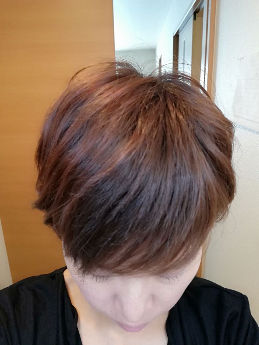 色落ちが早くって😅 暗い色にしても二週間くらいで抜けてくる😭 黒にしかみえないけど若干光あたるとちょっと紫がかってるかなって感じです 色落ちいつまで持つかなぁ。。 もう秋がやってくるから暗めにしちゃった🤭 子どもらは茶色がいいって言われる始末ですが(笑)😅