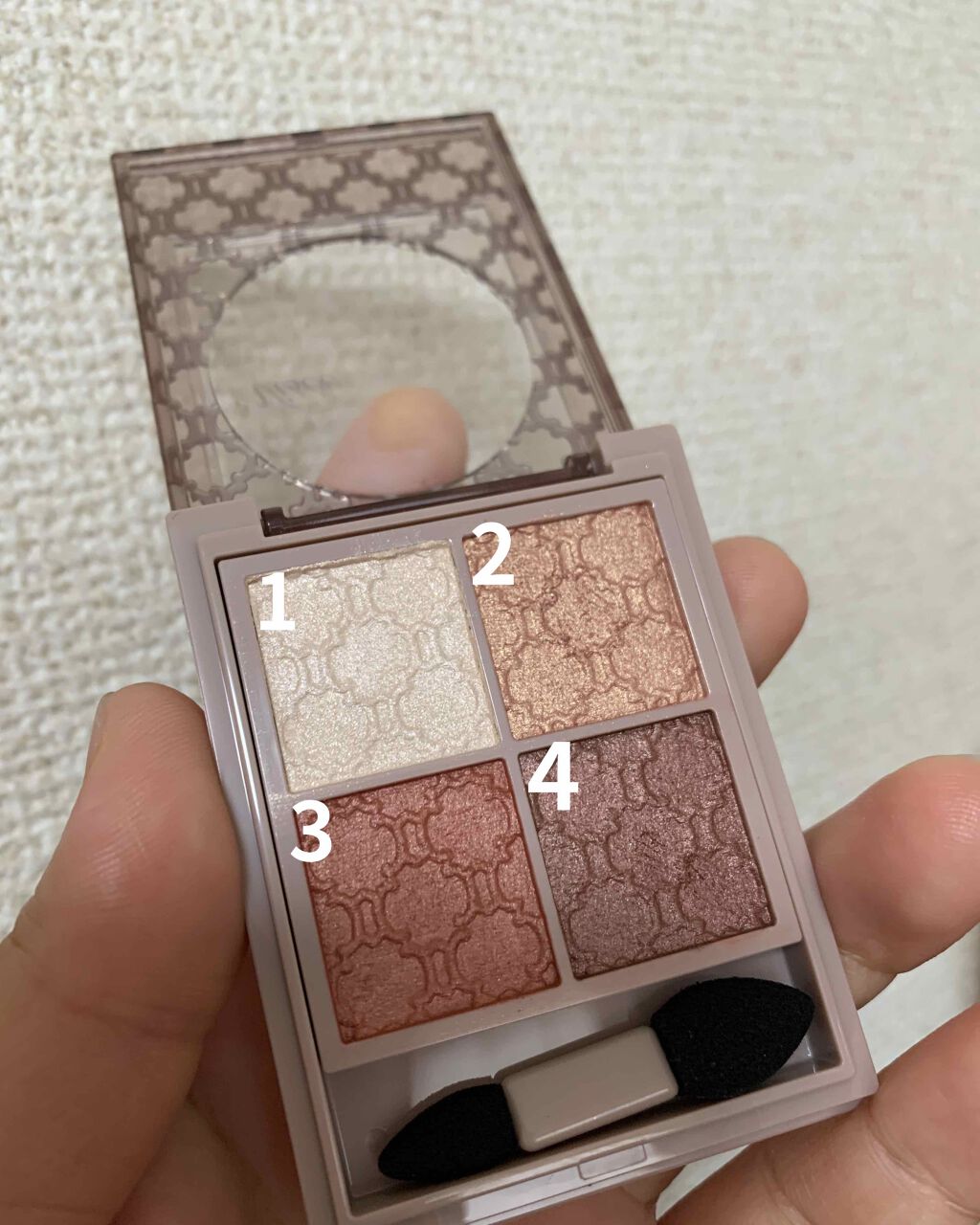 KATEtonedimensionalpaletteEX-2パープルブラウン系①ピンク細かめラメ入り 程よいツヤ感、他のパレットとも合わせやすそうなハイライト②濃いめピンク、目尻にアクセントとしてのせるくらい?③シェーディング用、使わない④グ...