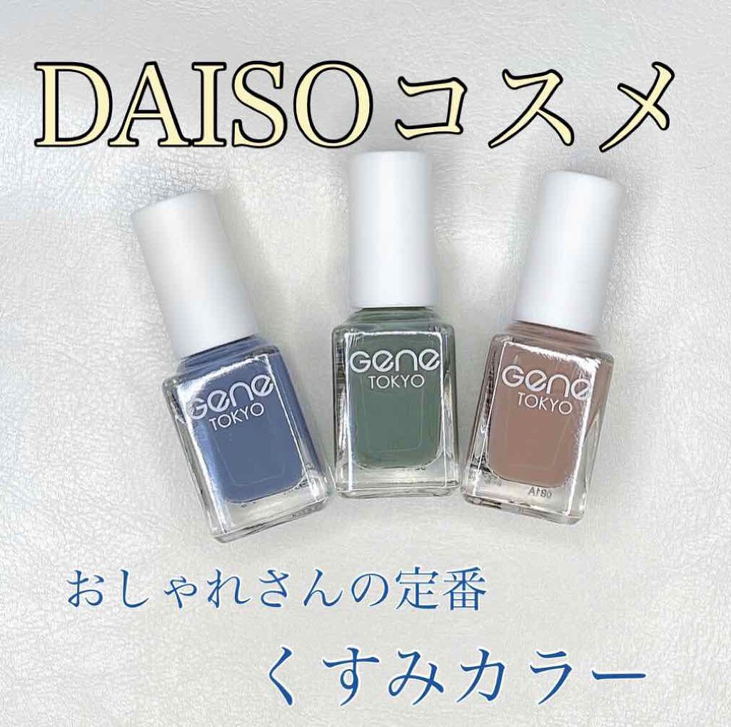 GENETOKYOキングオブofプチプラダイソーのネイルカラーをご紹介左⇨デニムブルー中⇨オリーブ右⇨ダークベージュ今回はくすみカラー3つをチョイス塗るとしっかり色でるので丁寧に塗れば1度塗りで全然OKでした🙆♀️...