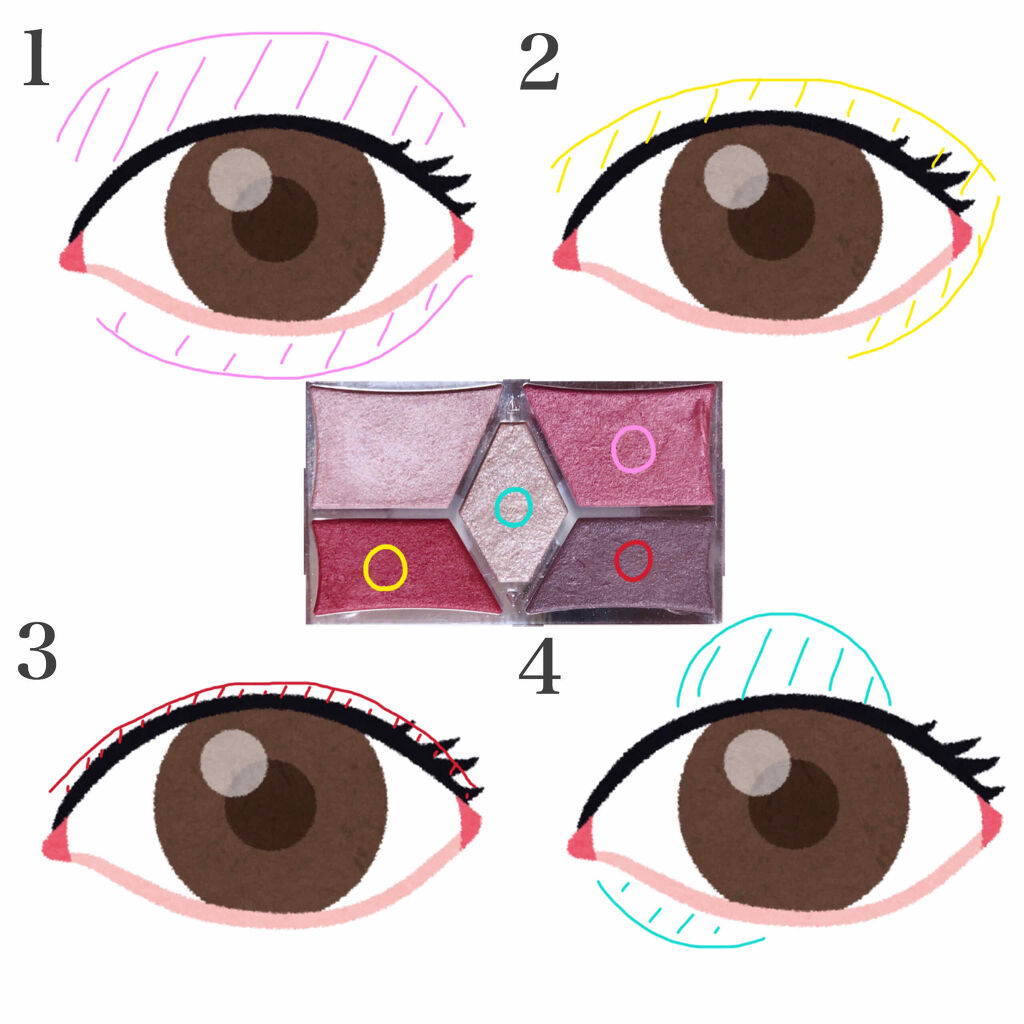 今日は可愛いローズピンクメイクを紹介していきたいと思います!それではスタート🍑♡①まずは右上の色をアイホール全体と下まぶたをうっすーくぬってください。塗りすぎ注意です⚠︎色がついたなぐらいでOK︎︎!②左下の色を二重幅(奥二重や一重の人は目を...
