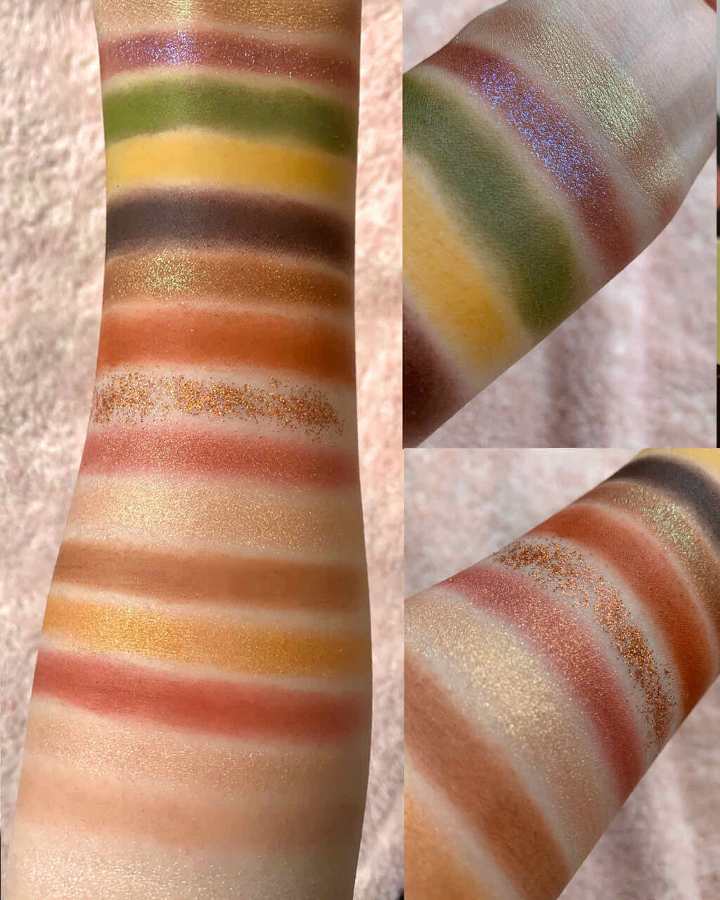 ZEESEA大英博物館エジプトシリーズアイシャドウパレット01アンダーソンの猫日没色❁❀✿✾2枚目・3枚目パレット中身4枚目スウォッチ(パレット上から1列目左→右、2列目…という順番で、腕には下から順番に塗っています。右端の画像2枚はラメ感が...