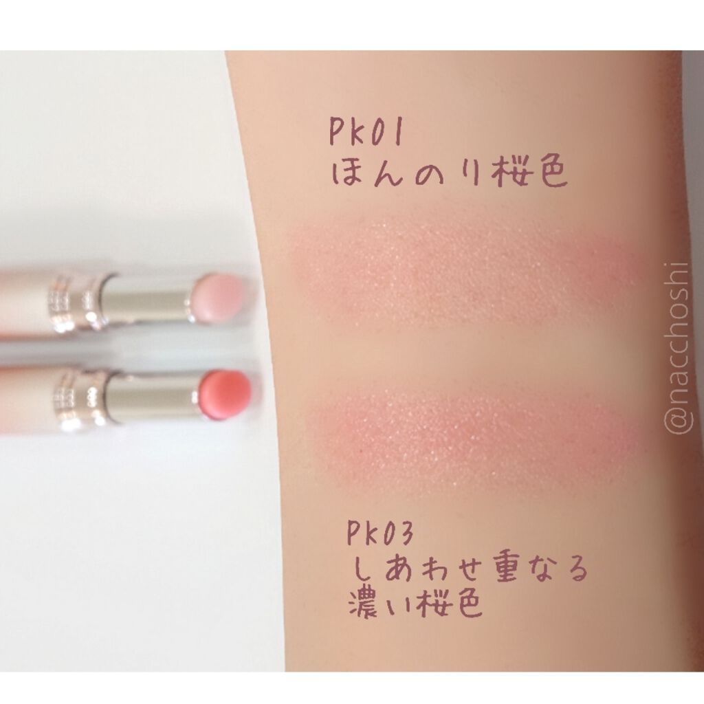 - <PK01 ほんのり桜色> スクワラン、リンゴ酸ジイソステアリル、ダイマージリノール酸(フィトステリル/イソステアリル/セチル/ステアリル/ベヘニル)、イソノナン酸イソトリデシル、トリ(カプリル酸/カプリン酸)グリセリル、トリイソステアリン酸ポリグリセリル-2、(イソステアリン酸ポリグリセリル-2/ダイマージリノール酸)コポリマー、ポリエチレン、水添ポリイソブテン、パラフィン、マイクロクリスタリンワックス、ダイマージリノール酸ジ(イソステアリル/フィトステリル)、オタネニンジン根エキス、ソメイヨシノ葉エキス、パルミトイルトリペプチド-1、ラウロイルグルタミン酸ジ(コレステリル/オクチルドデシル)、BG、水、イソステアリン酸ソルビタン、ジメチコン、トリベヘニン、パルミチン酸エチルヘキシル、BHT、フェノキシエタノール、メチルパラベン、エチルパラベン、プロピルパラベン、ブチルパラベン、酸化チタン、マイカ、赤223、赤226 <PK01> スクワラン、リンゴ酸ジイソステアリル、ダイマージリノール酸(フィトステリル/イソステアリル/セチル/ステアリル/ベヘニル)、イソノナン酸イソトリデシル、トリ(カプリル酸/カプリン酸)グリセリル、トリイソステアリン酸ポリグリセリル-2、(イソステアリン酸ポリグリセリル-2/ダイマージリノール酸)コポリマー、ポリエチレン、水添ポリイソブテン、パラフィン、マイクロクリスタリンワックス、ダイマージリノール酸ジ(イソステアリル/フィトステリル)、オタネニンジン根エキス、ソメイヨシノ葉エキス、パルミトイルトリペプチド-1、ラウロイルグルタミン酸ジ(コレステリル/オクチルドデシル)、BG、水、イソステアリン酸ソルビタン、ジメチコン、トリベヘニン、パルミチン酸エチルヘキシル、BHT、フェノキシエタノール、メチルパラベン、エチルパラベン、プロピルパラベン、ブチルパラベン、酸化チタン、マイカ、赤223、赤226 <RD01 燃ゆる紅桜色(プランパー)> スクワラン、リンゴ酸ジイソステアリル、ダイマージリノール酸(フィトステリル/イソステアリル/セチル/ステアリル/ベヘニル)、イソノナン酸イソトリデシル、トリ(カプリル酸/カプリン酸)グリセリル、トリイソステアリン酸ポリグリセリル-2、(イソステアリン酸ポリグリセリル-2/ダイマージリノール酸)コポリマー、合成ワックス、パラフィン、水添ポリイソブテン、マイクロクリスタリンワックス、ダイマージリノール酸ジ(イソステアリル/フィトステリル)、アテロコラーゲン、コンドロイチン硫酸Na、ソメイヨシノ葉エキス、パルミトイルトリペプチド-1、メントキシプロパンジオール、ラウロイルグルタミン酸ジ(コレステリル/オクチルドデシル)、BG、合成フルオロフロゴパイト、水、乳酸、イソステアリン酸ソルビタン、ジメチコン、テトライソステアリン酸ペンタエリスリチル、トリヒドロキシステアリン、トリベヘニン、パルミチン酸エチルヘキシル、ポリエチレン、バニリルブチル、BHT、トコフェロール、フェノキシエタノール、メチルパラベン、エチルパラベン、プロピルパラベン、ブチルパラベン、酸化スズ、酸化チタン、酸化鉄、赤201、赤202、赤223、橙201、黄4 <PK01 ほんのり桜色 (限定パッケージ)> スクワラン、リンゴ酸ジイソステアリル、ダイマージリノール酸(フィトステリル/イソステアリル/セチル/ステアリル/ベヘニル)、イソノナン酸イソトリデシル、トリ(カプリル酸/カプリン酸)グリセリル、トリイソステアリン酸ポリグリセリル-2、(イソステアリン酸ポリグリセリル-2/ダイマージリノール酸)コポリマー、ポリエチレン、水添ポリイソブテン、パラフィン、マイクロクリスタリンワックス、ダイマージリノール酸ジ(イソステアリル/フィトステリル)、オタネニンジン根エキス、ソメイヨシノ葉エキス、パルミトイルトリペプチド-1、ラウロイルグルタミン酸ジ(コレステリル/オクチルドデシル)、BG、水、イソステアリン酸ソルビタン、ジメチコン、トリベヘニン、パルミチン酸エチルヘキシル、BHT、フェノキシエタノール、メチルパラベン、エチルパラベン、プロピルパラベン、ブチルパラベン、酸化チタン、マイカ、赤223、赤226 <PK01> スクワラン、リンゴ酸ジイソステアリル、ダイマージリノール酸(フィトステリル/イソステアリル/セチル/ステアリル/ベヘニル)、イソノナン酸イソトリデシル、トリ(カプリル酸/カプリン酸)グリセリル、トリイソステアリン酸ポリグリセリル-2、(イソステアリン酸ポリグリセリル-2/ダイマージリノール酸)コポリマー、ポリエチレン、水添ポリイソブテン、パラフィン、マイクロクリスタリンワックス、ダイマージリノール酸ジ(イソステアリル/フィトステリル)、オタネニンジン根エキス、ソメイヨシノ葉エキス、パルミトイルトリペプチド-1、ラウロイルグルタミン酸ジ(コレステリル/オクチルドデシル)、BG、水、イソステアリン酸ソルビタン、ジメチコン、トリベヘニン、パルミチン酸エチルヘキシル、BHT、フェノキシエタノール、メチルパラ