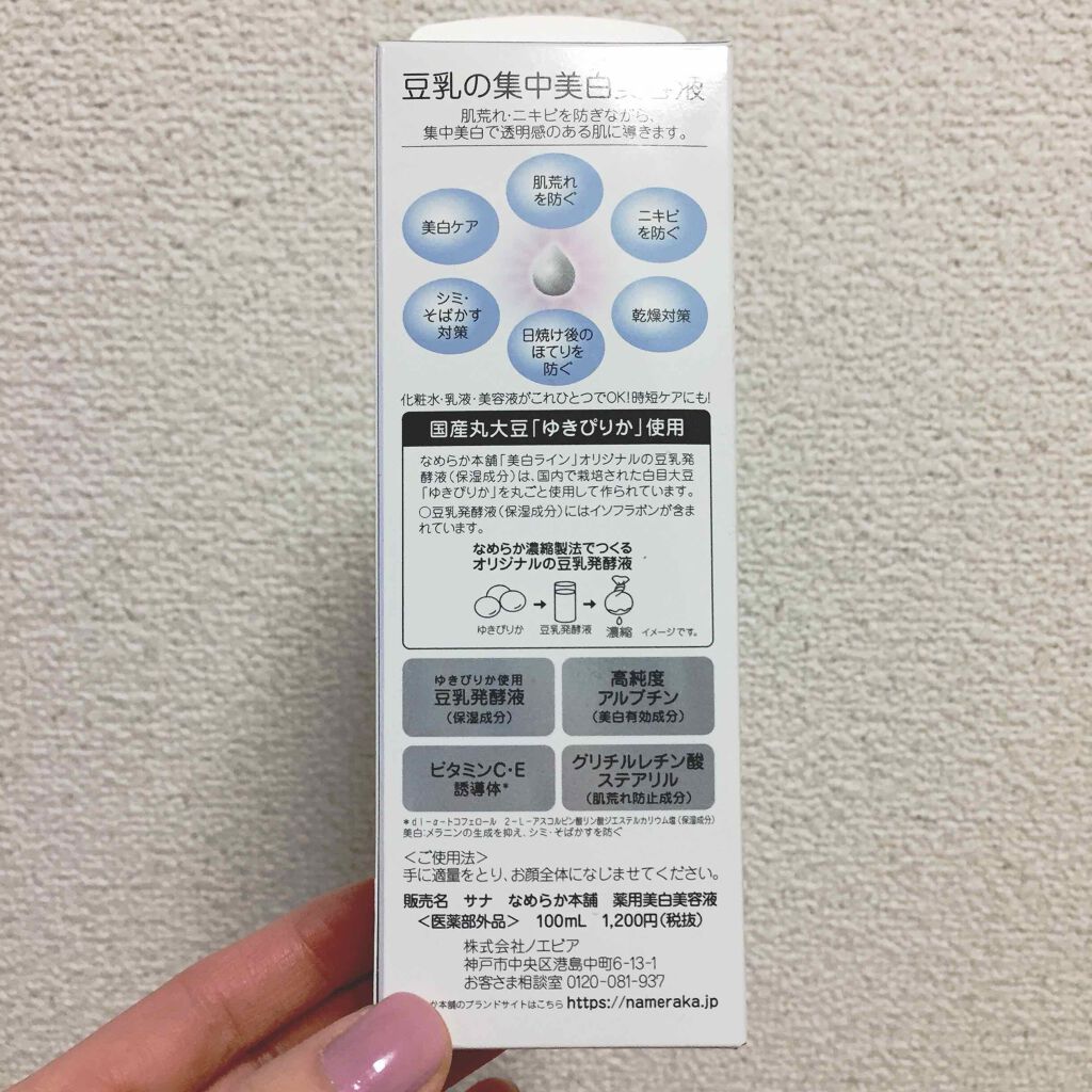 - <100ml> 水、BG、ジグリセリン、フェノキシエタノール、エタノール、ステアリン酸、セタノール、水酸化Na、濃グリセリン、グリチルレチン酸ステアリル、アルブチン、シュガースクワラン、カルボキシビニルポリマー、メチルポリシロキサン、豆乳発酵液、トリメチルグリシン、リン酸L-アスコルビルマグネシウム、アクリル酸・メタクリル酸アルキル共重合体、パラベン、水素添加大豆リン脂質、フィトステロール、ダイズエキス、親油型モノステアリン酸グリセリル、部分水素添加ホホバ油、モノステアリン酸ポリエチレングリコール、ジエチレントリアミン五酢酸五ナトリウム液、ポリオキシブチレンポリオキシエチレンポリオキシプロピレングリセリルエーテル(3B.O.)(8E.O.)(5P.O.)、dl-α-トコフェロール 2-L-アスコルビン酸リン酸ジエステルカリウム塩、モノパルミチン酸ポリオキシエチレンソルビタン(20E.O.)