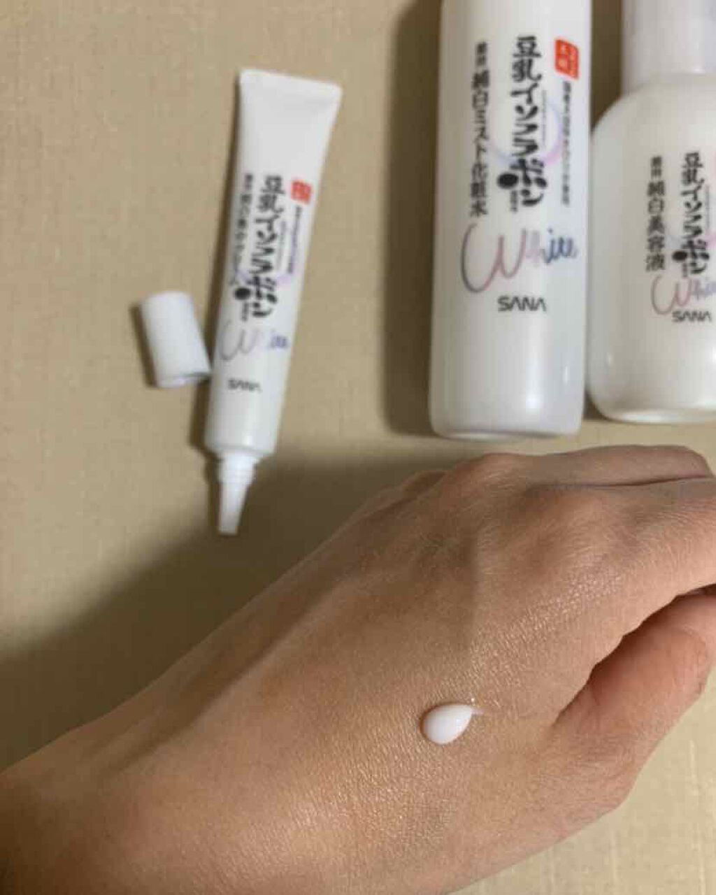 - <19g> 水、BG、フェノキシエタノール、エタノール、グリチルレチン酸ステアリル、アルブチン、ビタミンE、メチルポリシロキサン、豆乳発酵液、ダイズエキス、塩化ナトリウム、2-エチルヘキサン酸セチル、テトラ2-エチルヘキサン酸ペンタエリトリット、dl-α-トコフェリルリン酸ナトリウム、架橋型ポリエーテル変性シリコーン混合物、PEG-9 ポリジメチルシロキシエチル ジメチコン、dl-α-トコフェロール 2-L-アスコルビン酸リン酸ジエステルカリウム塩