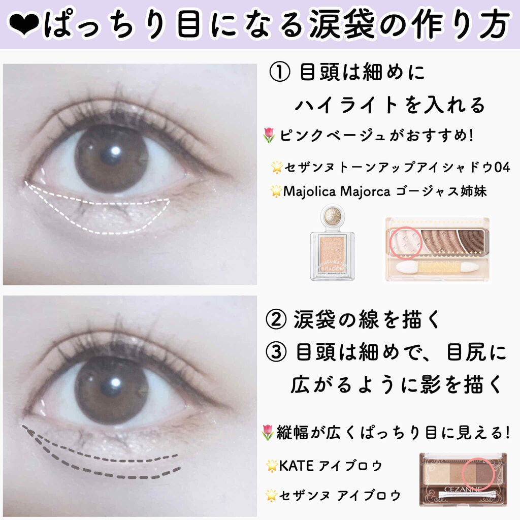 まずはnobevアンダーアイコンシーラーので目頭から黒目の下まで涙袋の土台を作ります。 このアイシャドウが綺麗な艶感のあるアイシャドウでギラギラ感もなく自然な立体感のある涙袋にしてくれます。 今までCEZANNEの描くふたえアイライナーをずっと使ってきましたがぷっくり感はアイブロウパウダーの方がだせると思います。