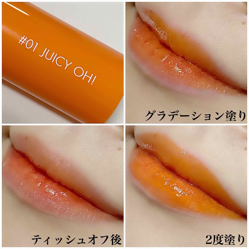- みずみずしいフルーツがきらめくようなシロップティント ①なめらかで潤いのあるリップを実現 ②果汁のシロップのようなカラー感 ③時間が経つにつれ凸凹を滑らかに密着しボリューム感を演出
