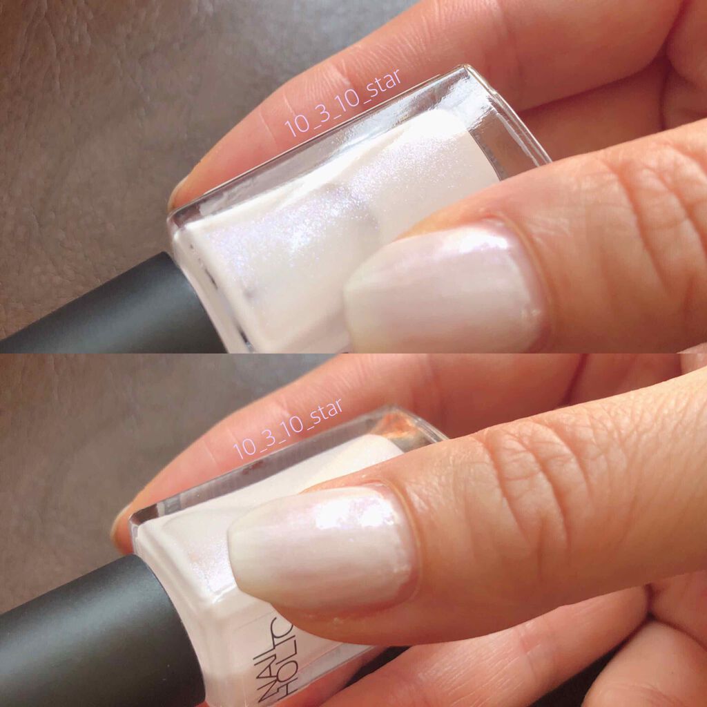 とみてちゃん😊🌸 ホワイトのベースにほのかな青、ピンクの偏光パールが可愛い🥰💓白だと、薄づきの方が手肌に馴染みそうだね❣️☺️