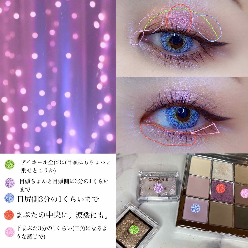 ラッキカラー『紫』淡いパープルなら馴染みやすい。パケも似たような色で揃うと可愛い♪💜キャンメイクシルキースフレアイズ12モーニングビオラピンクがかったような淡い紫が可愛い。しっとり粉質で優しい発色でラメがキラキラです。ブラシで塗るよりチップが...
