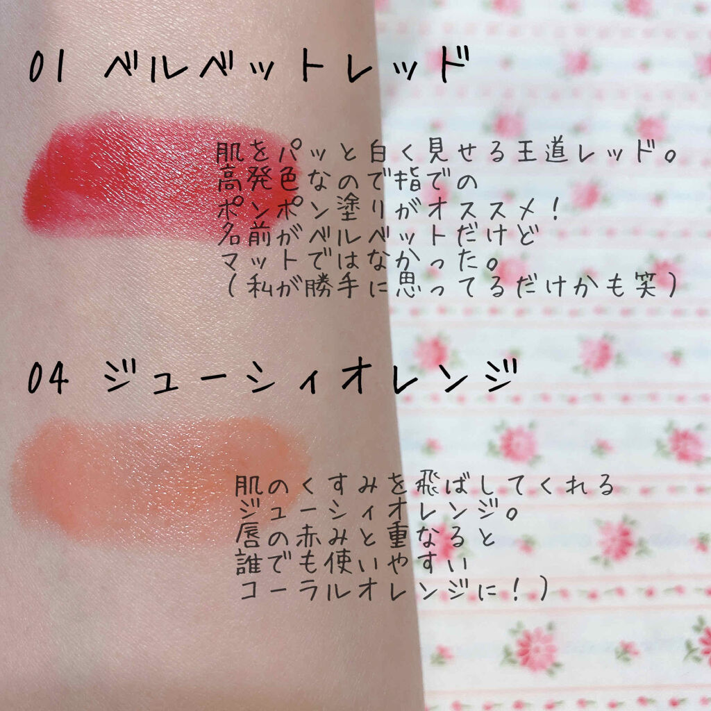 - ふわっととろけて ぽわんと発色 ティント処方の落ちないルージュ Chapter.1 血色感をあやつるリップ下地効果で、くすみを補正し肌まで明るく見える色づきに。 Chapter.2 光を集めるレフ板効果で、ナチュラルな立体感をあたえ、唇のまるさを強調。 Chapter.3 うるおいリップケア成分たっぷり配合で、乾かさない。