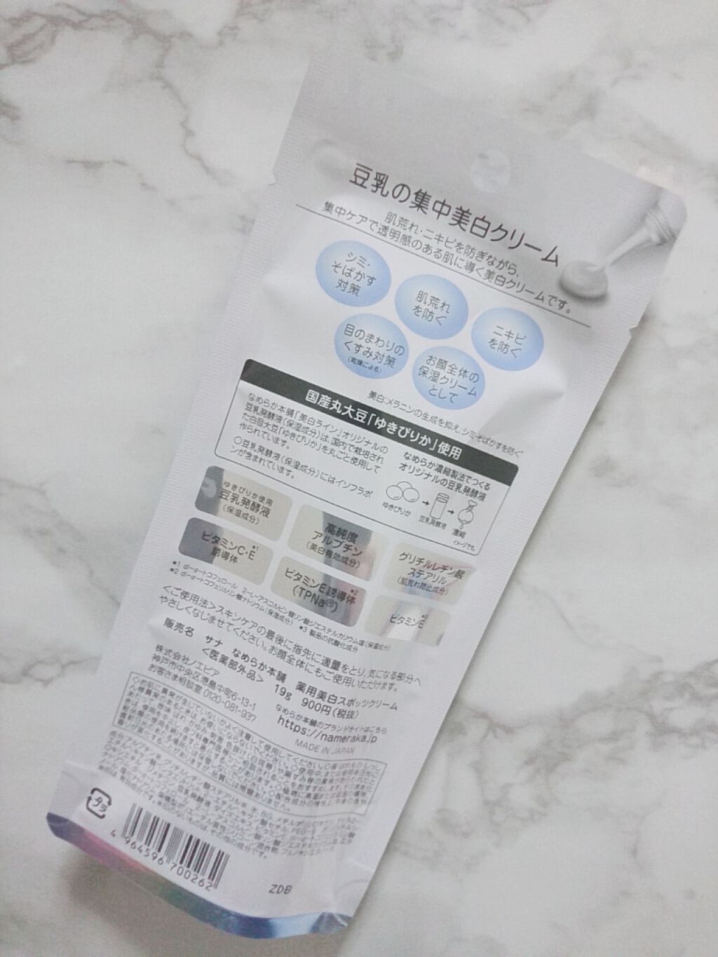 - <19g> 水、BG、フェノキシエタノール、エタノール、グリチルレチン酸ステアリル、アルブチン、ビタミンE、メチルポリシロキサン、豆乳発酵液、ダイズエキス、塩化ナトリウム、2-エチルヘキサン酸セチル、テトラ2-エチルヘキサン酸ペンタエリトリット、dl-α-トコフェリルリン酸ナトリウム、架橋型ポリエーテル変性シリコーン混合物、PEG-9 ポリジメチルシロキシエチル ジメチコン、dl-α-トコフェロール 2-L-アスコルビン酸リン酸ジエステルカリウム塩
