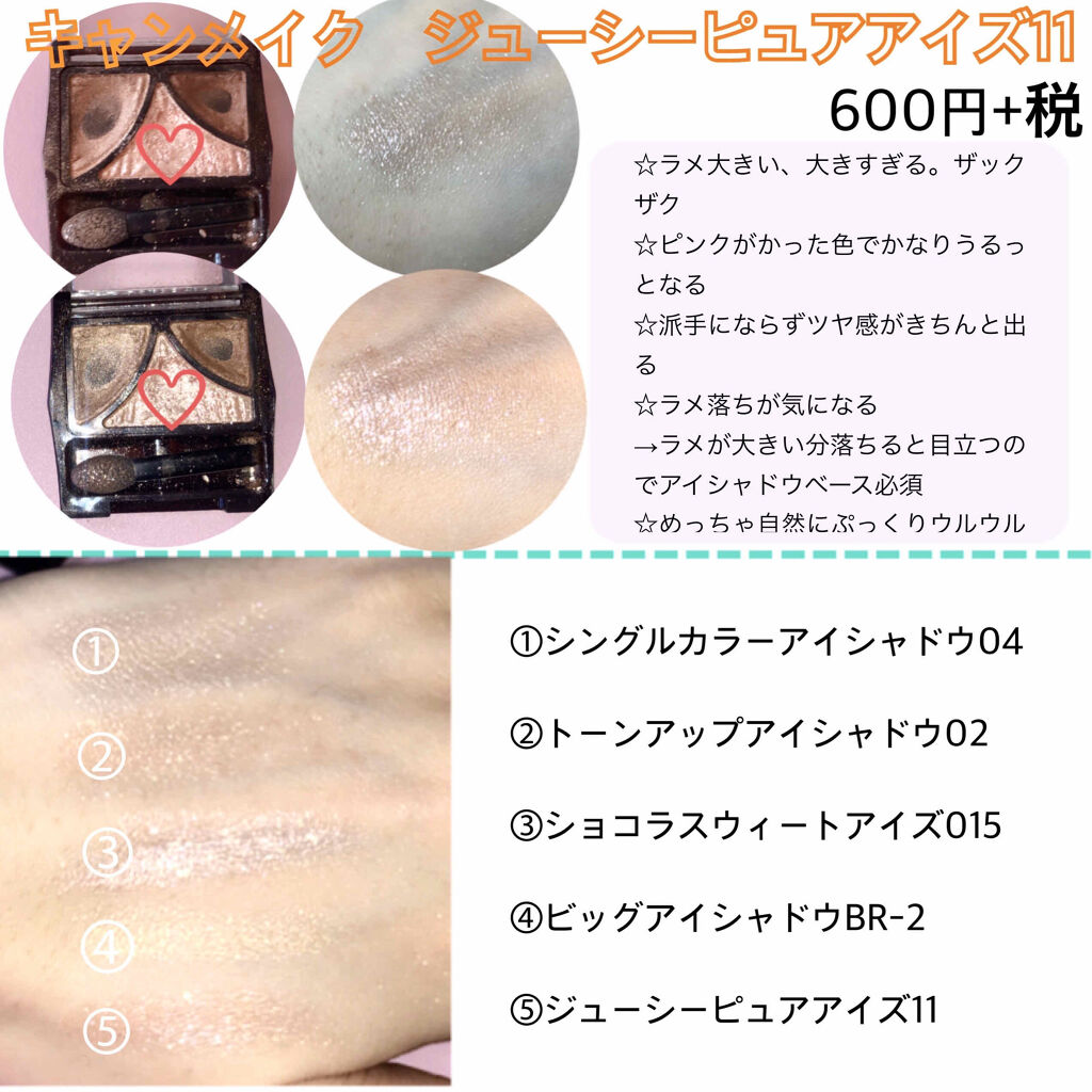 キャンメイクのジューシーピュアアイズ底見えだよ。 迷わず使えてかわいい色だから好き。 アイシャドウ ☆キャンメイク ジューシーピュアアイズ 14 テンダーフラワー アイライナー ☆キャンメイク ラスティングリキッドライナー 06 ローズグレージュ