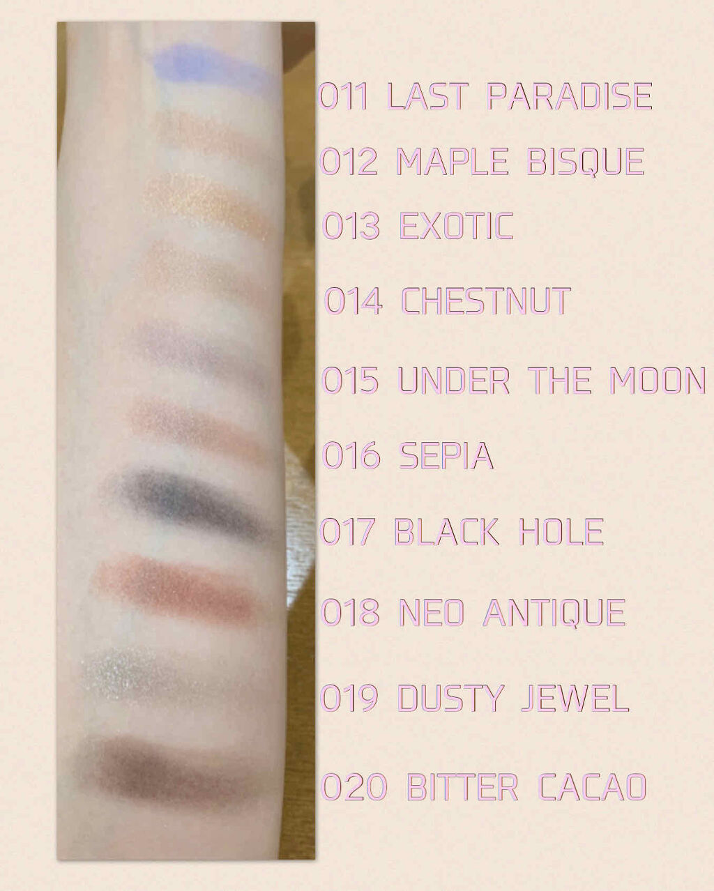 - <001 BEGINNING> タルク、ジメチコン、シリカ、ミネラルオイル、ナイロン-12、メチコン、トコフェロール、ヒアルロン酸Na、ラウリン酸亜鉛、金、合成ワックス、メチルパラベン、マイカ、酸化チタン、酸化鉄、硫酸Ba <003 COTTON PEARL> 合成金雲母、タルク、水添ポリイソブテン、ミネラルオイル、セスキイソステアリン酸ソルビタン、トコフェロール、ヒアルロン酸Na、イソドデカン、セスキステアリン酸ソルビタン、ワセリン、金、酸化スズ、メチルパラベン、グンジョウ、マイカ、酸化チタン、酸化亜鉛、酸化鉄 <004 MY DEAR> 合成金雲母、タルク、水添ポリイソブテン、ミネラルオイル、メタクリル酸メチルクロスポリマー、シリカ、セスキイソステアリン酸ソルビタン、トコフェロール、ヒアルロン酸Na、イソドデカン、セスキステアリン酸ソルビタン、ラウリン酸亜鉛、ワセリン、金、酸化スズ、メチルパラベン、グンジョウ、マイカ、酸化チタン、酸化亜鉛、酸化鉄、赤202 <005 ICE DANCE> タルク、合成金雲母、水添ポリイソブテン、ミネラルオイル、セスキイソステアリン酸ソルビタン、トコフェロール、ヒアルロン酸Na、イソドデカン、セスキステアリン酸ソルビタン、ワセリン、金、酸化スズ、グンジョウ、マイカ、酸化チタン、酸化亜鉛、酸化鉄 <006 COSMO PRISM> 合成金雲母、タルク、リンゴ酸ジイソステアリル、エチルヘキサン酸セチル、ホウケイ酸 (Ca/Al) 、ヘキサ (ヒドロキシステアリン酸/ステアリン酸/ロジン酸) ジペンタエリスリチル、セスキイソステアリン酸ソルビタン、メタクリル酸メチルクロスポリマー、トコフェロール、ヒアルロン酸Na、イソドデカン、ミネラルオイル、金、酸化スズ、グンジョウ、マイカ、酸化チタン、酸化亜鉛、酸化鉄 <007 ETERNITY RING> タルク、合成金雲母、水添ポリイソブテン、ミネラルオイル、ホウケイ酸 (Ca/Al) 、セスキイソステアリン酸ソルビタン、トコフェロール、ヒアルロン酸Na、イソドデカン、シリカ、セスキステアリン酸ソルビタン、ワセリン、金、酸化スズ、メチルパラベン、グンジョウ、マイカ、銀、酸化チタン、酸化亜鉛、酸化鉄 <008 SUNDRESS> 合成金雲母、タルク、水添ポリイソブテン、ミネラルオイル、セスキイソステアリン酸ソルビタン、トコフェロール、ヒアルロン酸Na、イソドデカン、セスキステアリン酸ソルビタン、ホウケイ酸 (Ca/Al) 、ワセリン、金、酸化スズ、メチルパラベン、グンジョウ、マイカ、酸化チタン、酸化亜鉛、酸化鉄、赤226 <009 GRASSHOPPER> タルク、合成金雲母、水添ポリイソブテン、ミネラルオイル、セスキイソステアリン酸ソルビタン、トコフェロール、ヒアルロン酸Na、イソドデカン、セスキステアリン酸ソルビタン、ワセリン、金、酸化スズ、グンジョウ、コンジョウ、マイカ、酸化チタン、酸化亜鉛、酸化鉄、硫酸Ba、黄4 <010 FROST MIRAGE> タルク、合成金雲母、水添ポリイソブテン、ミネラルオイル、セスキイソステアリン酸ソルビタン、トコフェロール、ヒアルロン酸Na、イソドデカン、セスキステアリン酸ソルビタン、ワセリン、金、酸化スズ、グンジョウ、マイカ、酸化チタン、酸化亜鉛、酸化鉄 <011 LAST PARADISE> タルク、ジメチコン、シリカ、ミネラルオイル、ナイロン-12、メチコン、トコフェロール、ヒアルロン酸Na、金、合成ワックス、メチルパラベン、グンジョウ、コンジョウ、マイカ、酸化チタン、酸化亜鉛、酸化鉄、赤202 <013 EXOTIC> 合成金雲母、水添ポリイソブテン、ミネラルオイル、タルク、セスキイソステアリン酸ソルビタン、トコフェロール、ヒアルロン酸Na、イソドデカン、セスキステアリン酸ソルビタン、ワセリン、金、酸化スズ、メチルパラベン、グンジョウ、マイカ、酸化チタン、酸化亜鉛、酸化鉄 <014 CHESTNUT> 合成金雲母、タルク、水添ポリイソブテン、ミネラルオイル、ホウケイ酸 (Ca/Al) 、セスキイソステアリン酸ソルビタン、トコフェロール、ヒアルロン酸Na、イソドデカン、セスキステアリン酸ソルビタン、ワセリン、金、酸化スズ、メチルパラベン、グンジョウ、マイカ、酸化チタン、酸化亜鉛、酸化鉄 <015 UNDER THE MOON> 合成金雲母、タルク、水添ポリイソブテン、ミネラルオイル、セスキイソステアリン酸ソルビタン、トコフェロール、ヒアルロン酸Na、イソドデカン、セスキステアリン酸ソルビタン、ワセリン、金、グンジョウ、コンジョウ、マイカ、酸化チタン、酸化亜鉛、酸化鉄 <016 SEPIA> タルク、合成金雲母、水添ポリイソブテン、ミネラルオイル、セスキイソステアリン酸ソルビタン、トコフェロール、ヒアルロン酸Na、イソドデカン、セスキステアリン酸ソルビタン、ワセリン、金、酸化スズ、グンジョウ、マイカ、酸化チタン、酸化亜鉛、酸化鉄 <017 BLACK HOLE> 合成金雲母、水添ポリイソブテン、ミネラルオイル、タルク、セスキイソステアリン酸ソルビタン、トコフェロール、ヒアルロン酸Na、イソドデカン、セスキステアリン酸ソルビタン、ワセリン、金、グンジョウ、マイカ、酸化チタン、酸化亜鉛