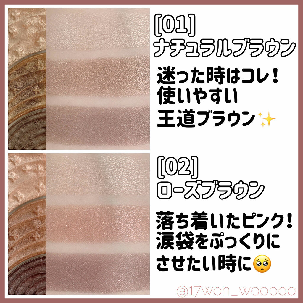 - 3色で簡単に明るく大きな目元に。 しっとり感触のアイシャドウ。 くすみを飛ばす明るさベース、ひとえ・奥二重の方でも幅広く塗れる肌なじみの良い中間色、 濃密高発色の締め色が目の輪郭を強調し大きな目元に。 微細パール配合でくすみを飛ばし、明るい目元へ。