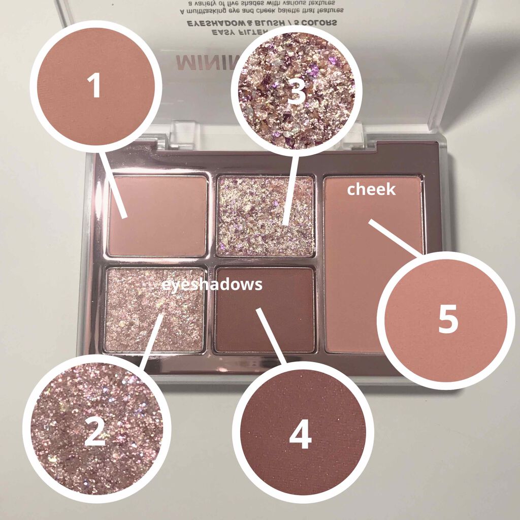 - 1つにアイシャドウ4色とチークが収まっているパレット。失敗しない5つのテクスチャーとカラーがポイント。気分やシーンに合わせてマルチに使えるパレットです。