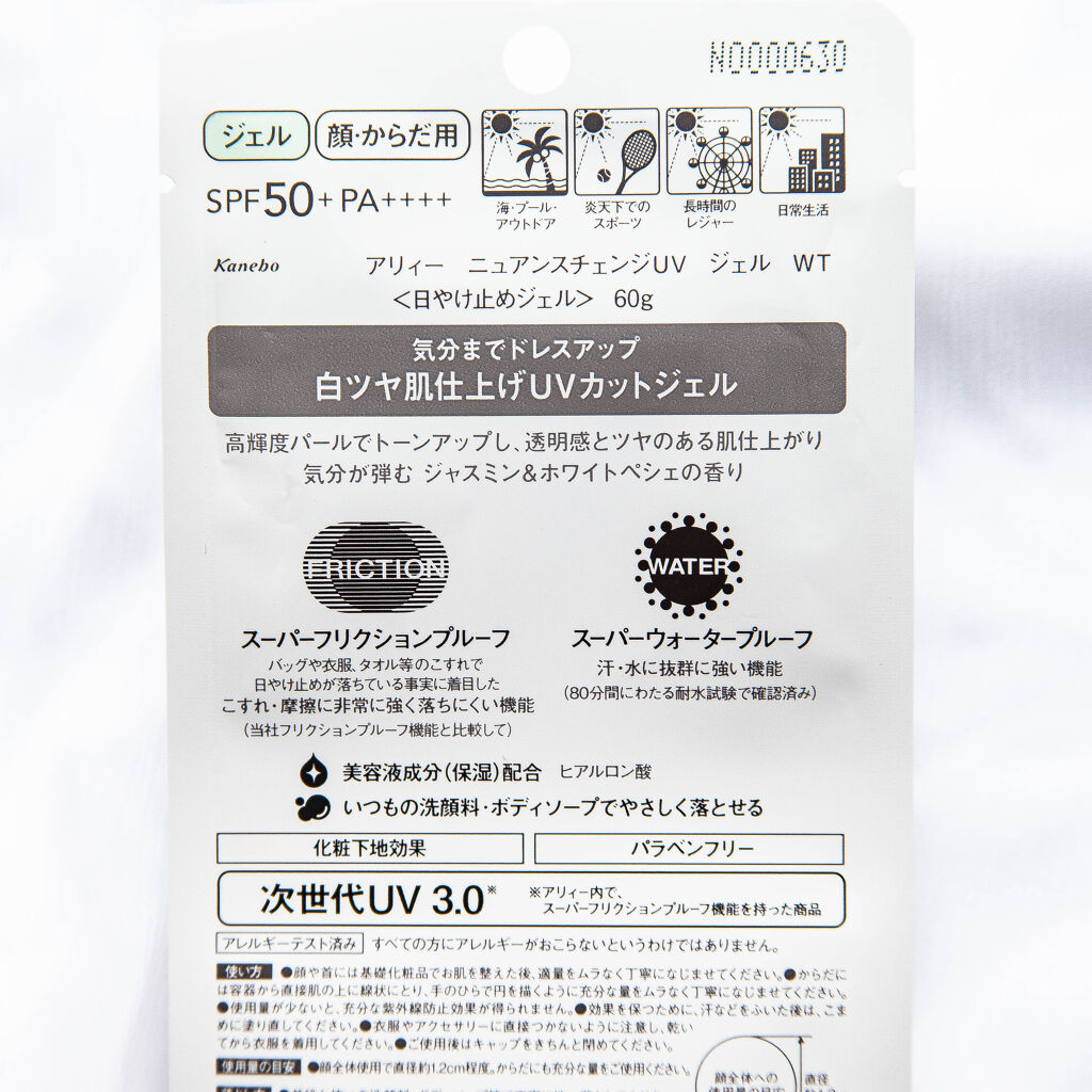 - 高輝度パールでトーンアップし、透明感のある白ツヤ肌仕上げUVカットジェル BRIGHT WHITE ブライトホワイト(気分が弾むジャスミン&ホワイトペシェの香り) 顔・からだ用/洗顔料・ボディソープで落とせる/トーンアップ※GEL ※高輝度パールによるメイク効果 ◆SPF50⁺・PA++++ ◆スーパーフリクションプルーフ ◆スーパーウォータープルーフ ◆深層部ダメージUVバリア技術ADVAN ◆化粧下地効果 ◆美容液成分(保湿)配合 ヒアルロン酸 ◆汗の嫌な臭いを感じさせにくくする技術(パフュマリエ調香) ◆パラベンフリー