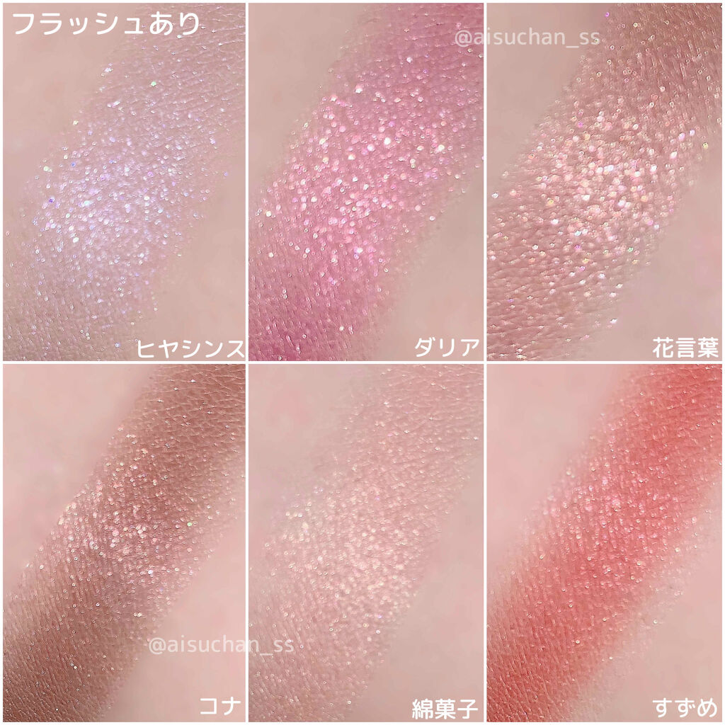 しっとりなめらかな粉質で、肌に光が溶け込む。 ツヤの美しさや発光具合は写真の通り。 ひと塗りで極上の艶を纏うことができます。 私が1番感動したのは 03 パールグロウ 水色やパープルをはじめとした細かいラメがぎっしり。 まるでダイヤモンドのような輝きでこれが最高💎 いざ肌に乗せると透明感たっぷりで白浮きしません。 今日アイシャドウとして使ってみたらまぶたが濡れたように艶めいて最高だった!! ラメ大好き芸人のみなさんは絶対チェックして欲しいです。 パケもしっかり可愛いです♡ 中身も見た目ももはや無敵。 これ、買わない理由ある??