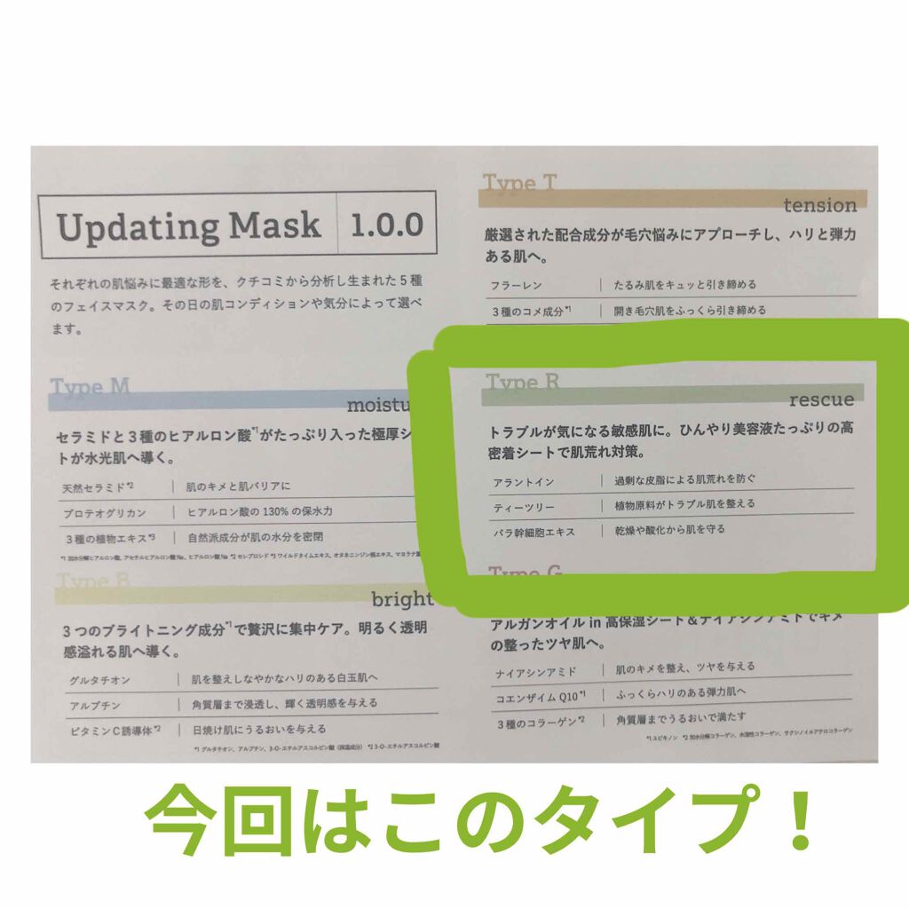 - それぞれの肌悩みに最適な形をクチコミから分析し生まれた5種のフェイスマスク。その日の肌コンディションや気分によって選べます。 Updating Mask(アップデーティング マスク) Type M (保湿) : セラミドと3種のヒアルロン酸*1がたっぷり入った極厚シートが水光肌へ導く。 Type B (透明感) : 3つのブライトニング成分*2で贅沢に集中ケア。明るく透明感溢れる肌へ導く。 Type T (毛穴対策) : 厳選された配合成分が毛穴悩みを全方位から解決し、ハリと弾力ある肌へ。 Type R (肌トラブル) : トラブルが気になる敏感肌に。ひんやり美容液たっぷりの高密着シートで肌荒れ対策。 Type G (ツヤ) : アルガンオイルin高保湿シート&ナイアシンアミドでキメの整ったツヤ肌へ。 *1 加水分解ヒアルロン酸、アセチルヒアルロン酸 Na、ヒアルロン酸 Na *2 グルタチオン、アルブチン、3-O-エチルアスコルビン酸(保湿成分)