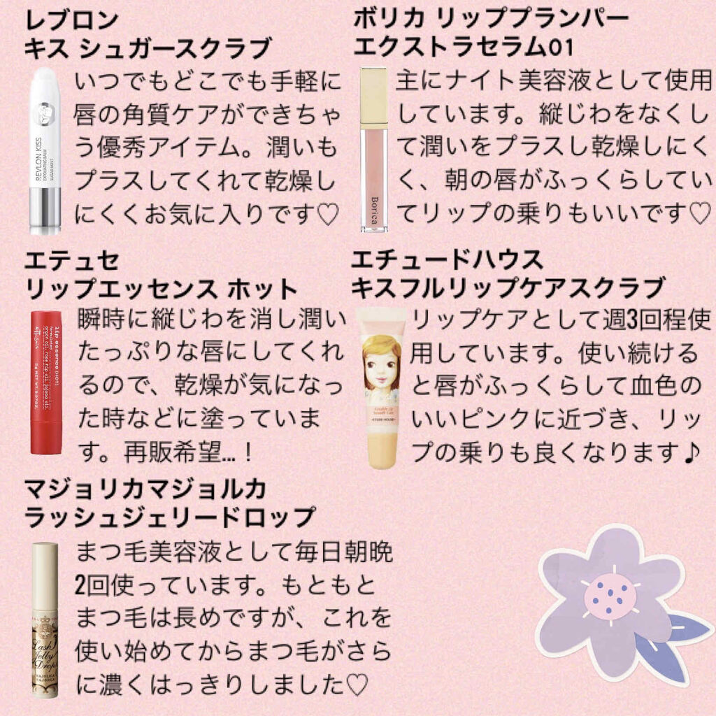 エクサージュホワイトは、2020年のベスコス乳液部門で第一位に輝いた美白乳液。化粧水の前の先行乳液としても、普通の乳液としても使っています◎ 高保湿で肌がしっとりもっちりするのに浸透が早いからいやなベタつきもなし。しっかり使い切れるようにパケが工夫されているのも嬉しい。 肌あたり滑らかで伸びが良く、濃密なテクスチャーが肌調子を上げてくれる大好きな乳液です♡ フローラドリップは田中みな実さんが愛用されていることでも話題になった名品。こちらも浸透が早く、肌がもっちもちになり香りにもとにかく癒されます。 そしてこれを使い始めてからマスク生活でも明らかにニキビができにくくなったし毛穴も目立たなくなりました...!くすみも抜けて肌が明るくなったような気がします。 どちらもベスコスに選ばれただけあり、本当に優秀。肌荒れが気になる方にもめちゃくちゃおすすめなのでぜひチェックしてみてください💐