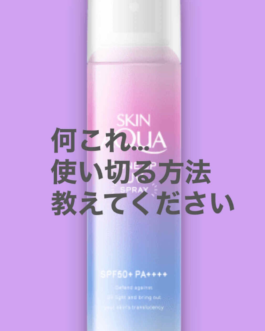 - 「スキンアクア トーンアップUVスプレー」は、UVカットしながら、色と光をコントロールし、肌をトーンアップ*1。 あなただけの透明感*1を引き出すラベンダーカラーの顔・からだ用日やけ止め。 すーっとのびて、さらりとした使い心地。日やけ止めを塗っているだけなのに、透明感*1のある肌に。 透明感ブルー×血色感ピンク=ラベンダーカラーで、ナチュラルな透明感を演出! 日光や光を反射し、肌の透明感をあげながら*1立体的にツヤめく微細なストロボパール*2配合。 スキンケア成分(保湿成分)としてヒアルロン酸Na、ビタミンC誘導体*3、ピュアニュアンスコンプレックス*4配合。 使用前に缶を上下に強く4~5回振り、肌から10~15cmくらい離してスプレーし、ムラなくのばしてください。 缶は上下逆さまでも使えます。ときめくサボンの香り。 スーパーウォータープルーフ。せっけんで落とせます。 防腐剤フリー。鉱物油フリー。アレルギーテスト済み(全ての方にアレルギーが起こらないというわけではありません。) *1:メイクアップ効果による *2:酸化チタン、マイカ(光沢剤) *3:リン酸アスコルビルMg *4:クダモノトケイソウ果実エキス、プルーン分解物、イザヨイバラエキス 紫外線防止成分:紫外線吸収剤