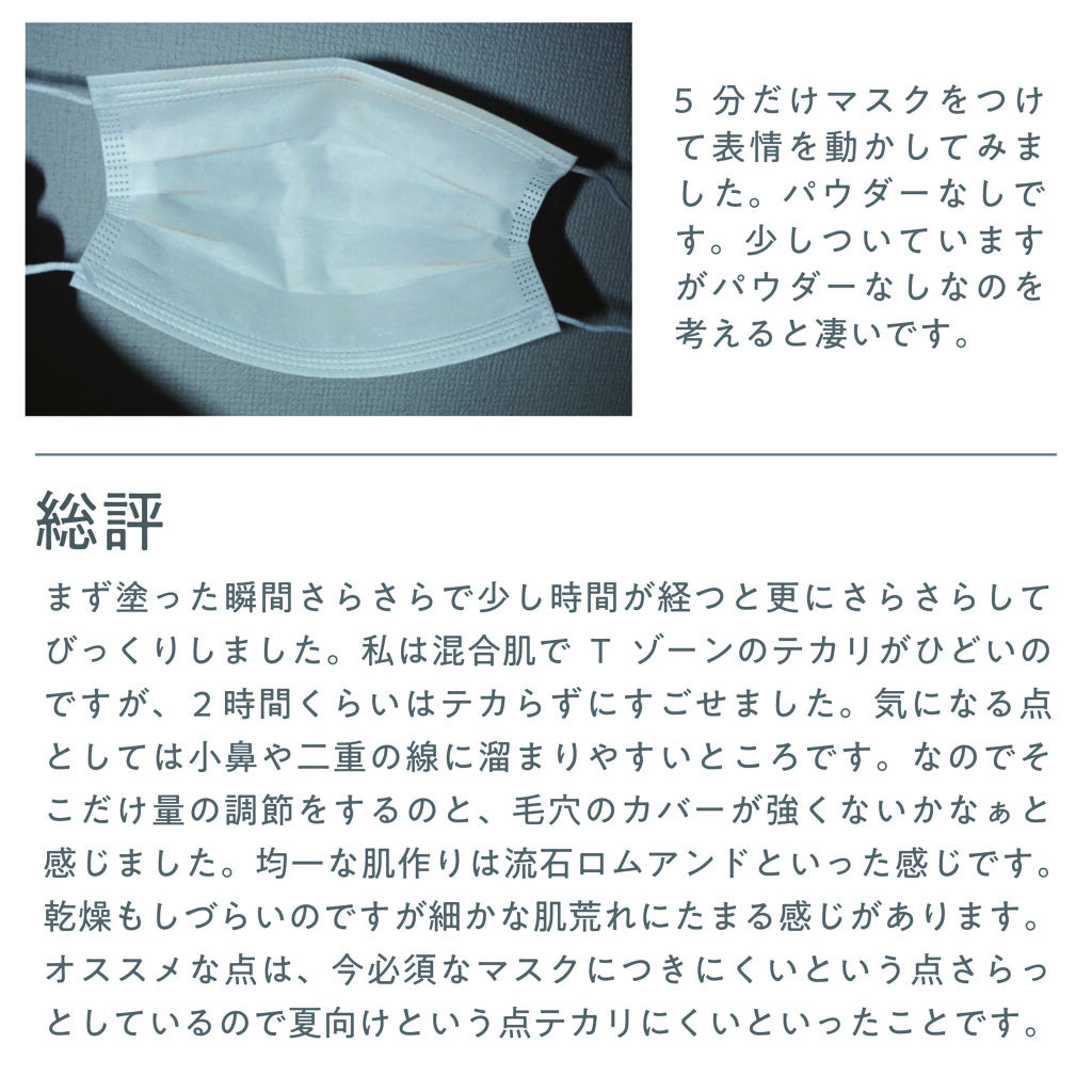 - マットのさらさら感だけずっとずっっと!①テカリはもうストップ#No Sebumさらさら②一度だけでOK#密着持続力③毛穴やシミを#さっとカバー