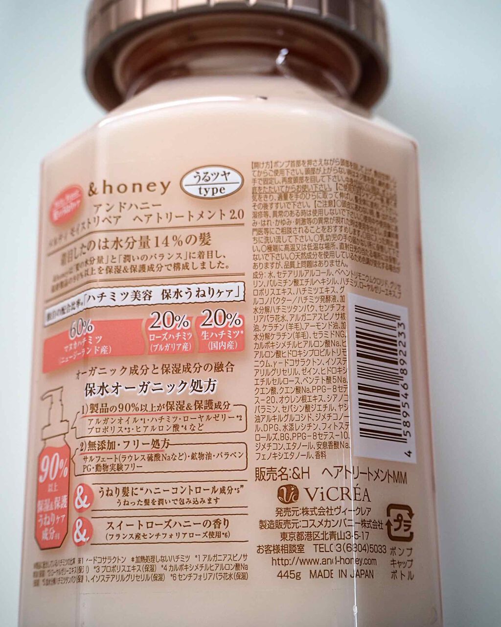 - <シャンプー大容量つめかえ(875mL)> 水、BG、グリセリン、ジメチコン、グルコノバクター/ハチミツ発酵液、フェノキシエタノール、香料、エタノール、ローヤルゼリーエキス、メトキシケイヒ酸エチルヘキシル、セラミドNG、アルギニン、ハチミツ、DPG、セテアリルアルコール、イソステアリルグリセリル、水添レシチン、パルミチン酸エチルヘキシル、センチフォリアバラ花水、ヒドロキシエチルセルロース、メントール、クエン酸、ココイルグルタミン酸TEA、ポリクオタニウム-10、γ-ドコサラクトン、ベヘントリモニウムクロリド、ヒアルロン酸ヒドロキシプロピルトリモニウム、アルガニアスピノサ核油、オウレン根エキス、ペンテト酸5Na、ラウロイルメチルアラニンNa、ラウラミドプロピルベタイン、シアノコバラミン、フィトステロールズ、セバシン酸ジエチル、黄4、EDTA-2Na、クエン酸Na、ダマスクバラ花水、安息香酸Na、アーモンド油、ヤシ油アルキルグルコシド、ゼイン、赤227、ジメチコノール、オレフィン(C14-16)スルホン酸Na、カルボキシメチルヒアルロン酸Na、ジエチルアミノヒドロキシベンゾイル安息香酸ヘキシル、ハチミツエキス、プロポリスエキス、加水分解ケラチン(羊毛)、コカミドメチルMEA、PPG-7、PPG-8セテス-20、ポリクオタニウム-47、ミリスチルベタイン、加水分解ハチミツタンパク、ケラチン(羊毛)、PPG-8セテス-10 <ヘアトリートメント大容量つめかえ(875g)> 水、BG、グリセリン、ジメチコン、グルコノバクター/ハチミツ発酵液、フェノキシエタノール、香料、エタノール、ローヤルゼリーエキス、メトキシケイヒ酸エチルヘキシル、セラミドNG、アルギニン、ハチミツ、DPG、セテアリルアルコール、イソステアリルグリセリル、水添レシチン、パルミチン酸エチルヘキシル、センチフォリアバラ花水、ヒドロキシエチルセルロース、メントール、クエン酸、ココイルグルタミン酸TEA、ポリクオタニウム-10、γ-ドコサラクトン、ベヘントリモニウムクロリド、ヒアルロン酸ヒドロキシプロピルトリモニウム、アルガニアスピノサ核油、オウレン根エキス、ペンテト酸5Na、ラウロイルメチルアラニンNa、ラウラミドプロピルベタイン、シアノコバラミン、フィトステロールズ、セバシン酸ジエチル、黄4、EDTA-2Na、クエン酸Na、ダマスクバラ花水、安息香酸Na、アーモンド油、ヤシ油アルキルグルコシド、ゼイン、赤227、ジメチコノール、オレフィン(C14-16)スルホン酸Na、カルボキシメチルヒアルロン酸Na、ジエチルアミノヒドロキシベンゾイル安息香酸ヘキシル、ハチミツエキス、プロポリスエキス、加水分解ケラチン(羊毛)、コカミドメチルMEA、PPG-7、PPG-8セテス-20、ポリクオタニウム-47、ミリスチルベタイン、加水分解ハチミツタンパク、ケラチン(羊毛)、PPG-8セテス-10 <シャンプー1.0(詰替え) 385ml> 水、ラウラミドプロピルベタイン、オレフィン(C14-16)スルホン酸Na、ラウロイルメチルアラニンNa、グリセリン、コカミドメチルMEA、ココイルグルタミン酸TEA、ハチミツ、ハチミツエキス、ローヤルゼリーエキス、加水分解ハチミツタンパク、プロポリスエキス、グルコノバクター/ハチミツ発酵液、γ-ドコサラクトン、アルガニアスピノサ核油、加水分解ケラチン(羊毛)、ダマスクバラ花水、ポリクオタニウム-47、ポリクオタニウム-10、ケラチン(羊毛)、ヤシ油アルキルグルコシド、安息香酸Na、BG、PPG-7、フェノキシエタノール、EDTA-2Na、セバシン酸ジエチル、ミリスチルベタイン、黄4、アルギニン、メントール、メトキシケイヒ酸エチルヘキシル、赤227、ジエチルアミノヒドロキシベンゾイル安息香酸ヘキシル、クエン酸、香料、セテアリルアルコール、ベヘントリモニウムクロリド、パルミチン酸エチルヘキシル、センチフォリアバラ花水、アーモンド油、セラミドNG、カルボキシメチルヒアルロン酸Na、ヒアルロン酸ヒドロキシプロピルトリモニウム、イソステアリルグリセリル、ゼイン、ヒドロキシエチルセルロース、ペンテト酸5Na、クエン酸Na、PPG-8セテス-20、オウレン根エキス、シアノコバラミン、ジメチコノール、DPG、水添レシチン、フィトステロールズ、PPG-8セテス-10、ジメチコン、エタノール <トリートメント詰替え 増量 385ml > 水、ラウラミドプロピルベタイン、オレフィン(C14-16)スルホン酸Na、ラウロイルメチルアラニンNa、グリセリン、コカミドメチルMEA、ココイルグルタミン酸TEA、ハチミツ、ハチミツエキス、ローヤルゼリーエキス、加水分解ハチミツタンパク、プロポリスエキス、グルコノバクター/ハチミツ発酵液、γ-ドコサラクトン、アルガニアスピノサ核油、加水分解ケラチン(羊毛)、ダマスクバラ花水、ポリクオタニウム-47、ポリクオタニウム-10、ケラチン(羊毛)、ヤシ油アルキルグルコシド、安息香酸Na、BG、PPG-7、フェノキシエタノール、EDTA-2Na、セバシン酸ジエチル、ミリスチルベタイン、黄4、アルギニン、メントール、メトキシケイヒ酸エチルヘキシル、赤227、ジエチルアミノヒドロキシベンゾイ