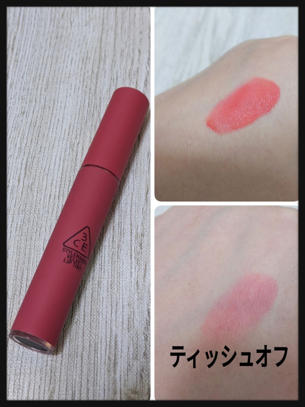 3CEベルベットリップティントトイレットペーパーという雑誌とのコラボパケ!カラーは既存色トープ、です。パケとこの色が好きすぎて発売されて速攻で買ったのはだいぶ前だけどいまだに好き。ドス黒い感じのリップ、一本は欲しかった。色は実際この色の強さだ...
