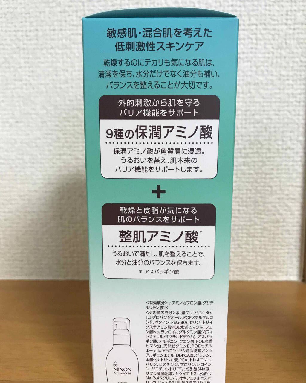 - 乾燥もテカりも気になる肌にすっとなじんでうるおい補給 水のようにさっぱりしているのに、うるおいに満たされる使い心地。 肌あれ・ニキビを防ぐアミノ酸※1と植物性※2有効成分配合。 角質層をやわらげ、みずみずしい肌に整えます。 1.洗顔後、清潔な手のひらに適量(3~5プッシュ)を取ります。 2.顔全体にやさしくなじませます。 *使い始めは中身が出るまで、ポンプを数回押してください。 *中身が出しにくい時は、ポンプの向きを変えて、数回プッシュしてください。 販売名:ミノンアミノモイストBL[医薬部外品]
