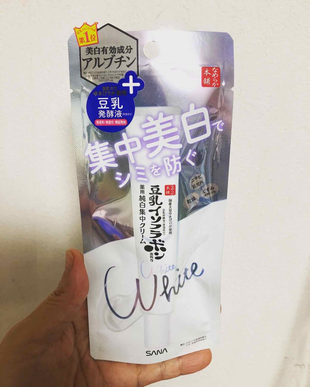 - <19g> 水、BG、フェノキシエタノール、エタノール、グリチルレチン酸ステアリル、アルブチン、ビタミンE、メチルポリシロキサン、豆乳発酵液、ダイズエキス、塩化ナトリウム、2-エチルヘキサン酸セチル、テトラ2-エチルヘキサン酸ペンタエリトリット、dl-α-トコフェリルリン酸ナトリウム、架橋型ポリエーテル変性シリコーン混合物、PEG-9 ポリジメチルシロキシエチル ジメチコン、dl-α-トコフェロール 2-L-アスコルビン酸リン酸ジエステルカリウム塩