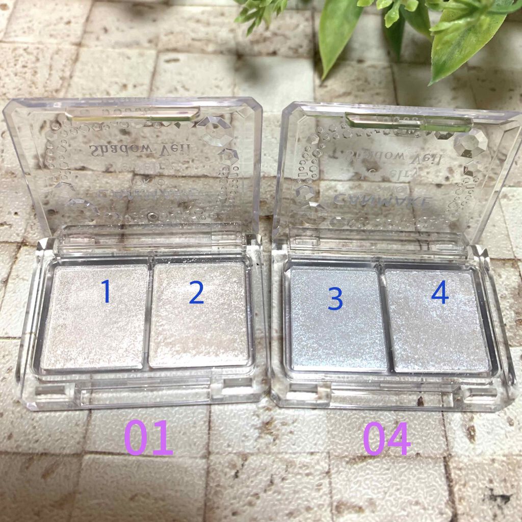 輝きだけをのせる! ベースカラーは透明でラメだけを楽しむアイシャドウ♡ 「01 イノセントクリスタル」というカラーは白みシルバーのラメでイエベ肌に塗るとちょっぴり水色に見えたよ〜! ラメのサイズは大小2種類で重ねて楽しめるらしい。